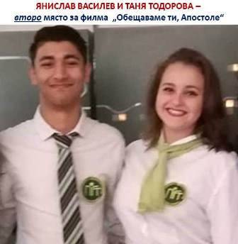 “На кладата на свободата” е озаглавено видеото, заело първо място. Негови автори са единадесетокласниците Стефан Филев от специалност “Организация на туризма и свободното време” и Надежда Иванова, която учи кетъринг. Техни ръководители учителите по история и цивилизация Бистра Стефанова и по икономическите предмети инж. Славка Проданова. На второ място е класирано видеото “Обещаваме ти, Апостоле!”, разработено от Янислав Василев и Таня Тодорова от 11 клас на специалност “Кетъринг” с ръководител инж. Славка Проданова.