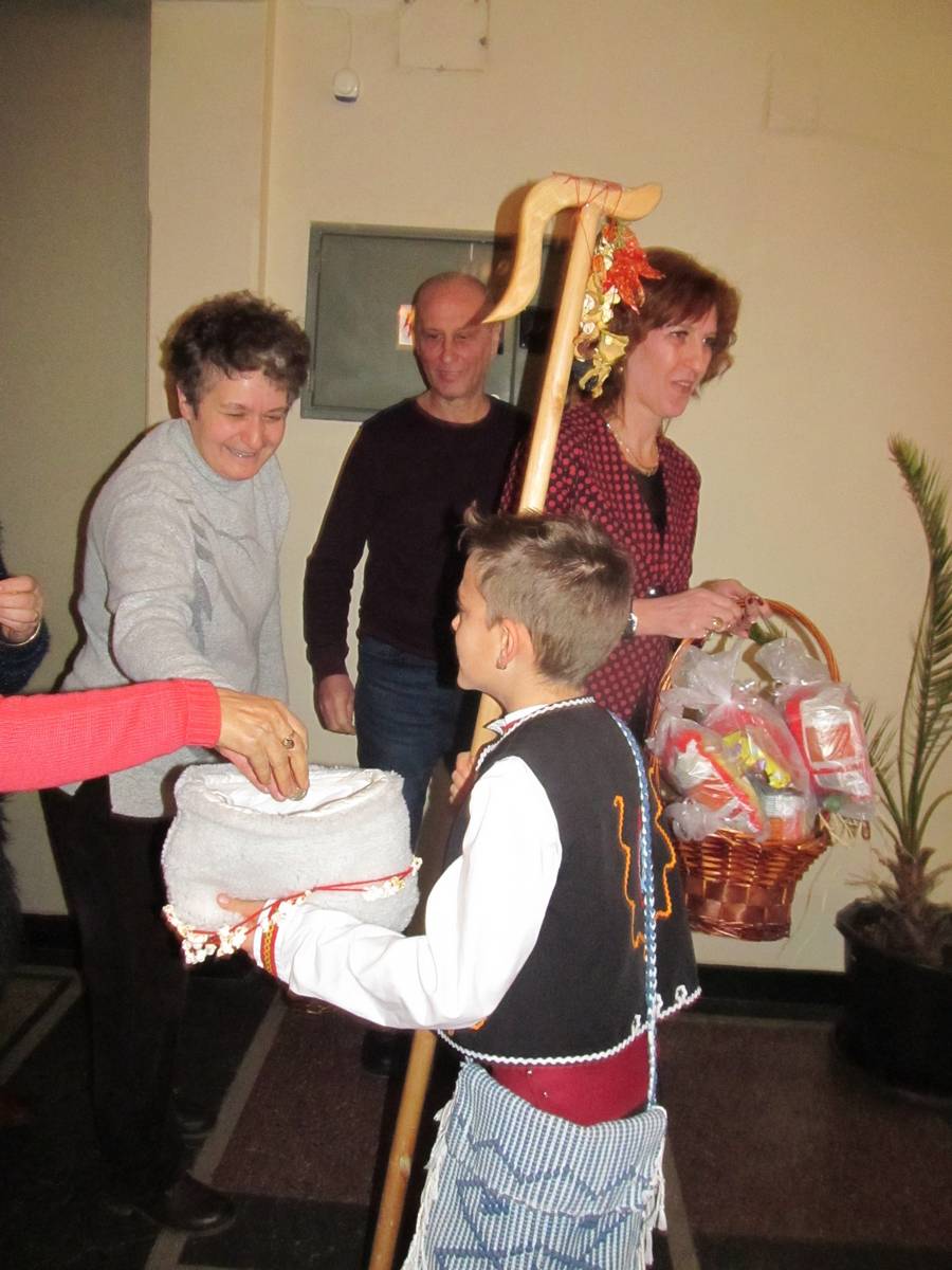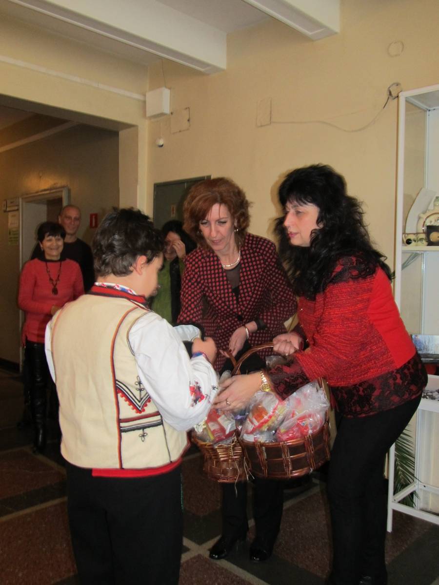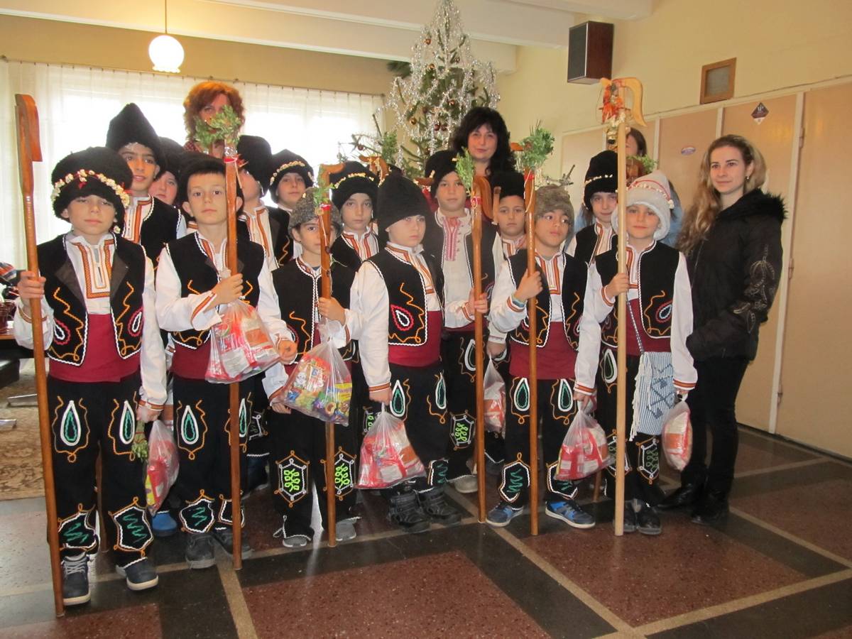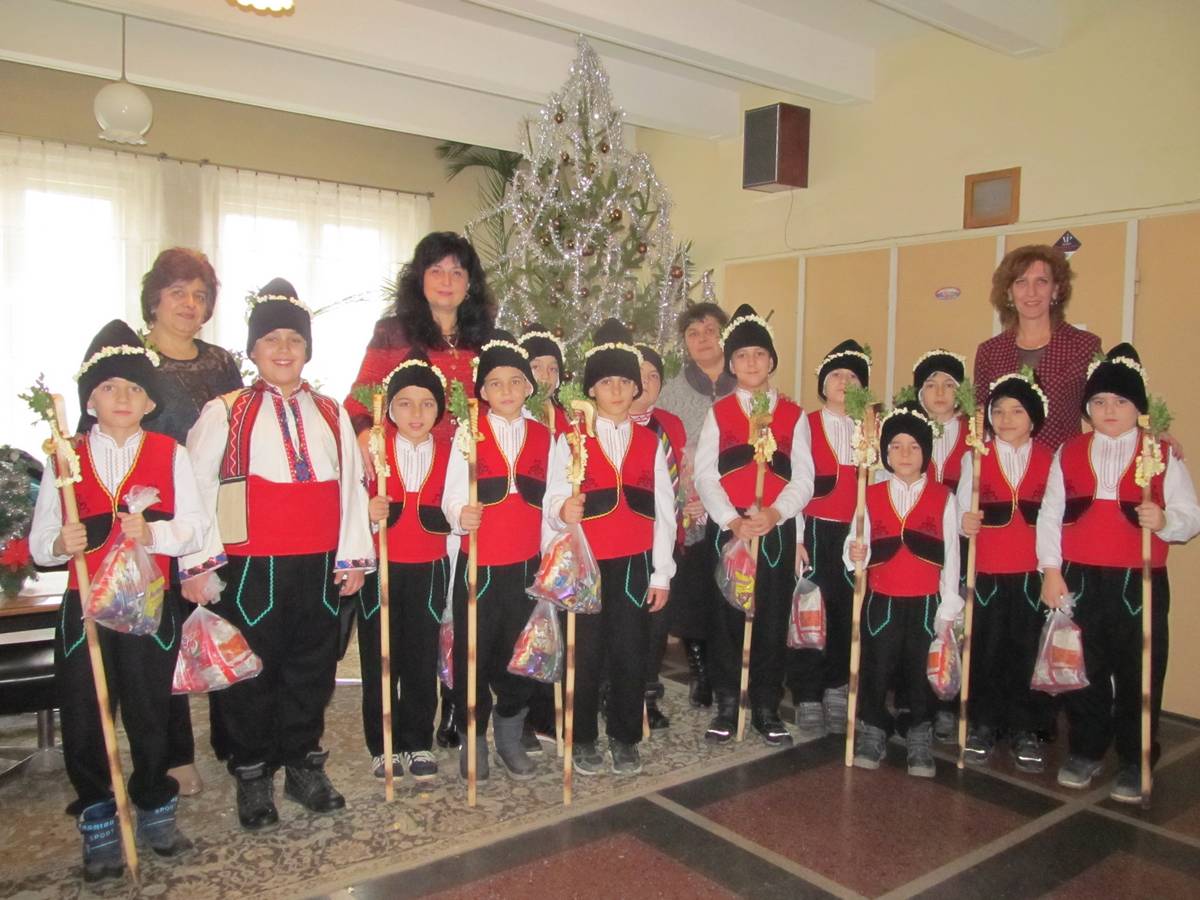 Децата изпяха коледарските си песни, тропнаха с гегите и казаха „Да бъде”. Всеки от дружината отправи наричания за здраве, плодородие и „пълна къща”. От свое име и от името на колегите си, кметът д-р Гецова, благодари и пожела на учители и ученици успешна Нова година, сбъдване на всички желания, и както децата нарекоха за „пълна къща”, така домакинята им отговори да са пълни бележниците им с шестици. Д-р Гецова дари всяко коледарче с пакетче със сладкиши, а в калпака на водещия коледар, всички напускаха парички като отплата за добрите пожелания.