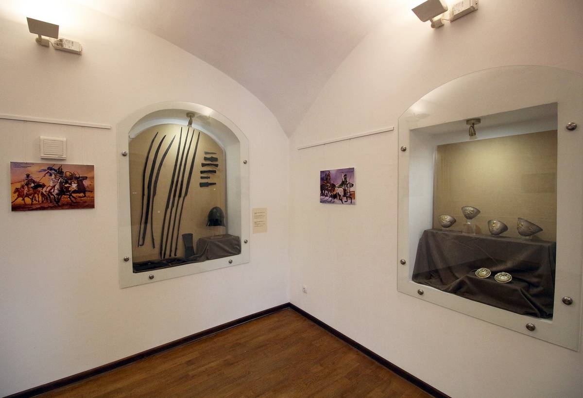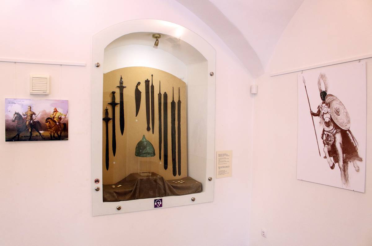 В експозицията преходът между праисторическите култури и класическата тракийска история е представен с едноостри и двуострите железните мечове /махайри, акинаци/, железни върхове на копия, плоските кръстовидни брадви, ножове – акинаци, ромфеи, следвани хронологически от мечовете „келтски тип“ и римските мечове. Особено място е отредено на двойната брадва – лабриса. Ранните екземпляри са изработени от камък. Неин прототип се явяват тежките медни брадви с отвор по средата, известни като брадви – тесли.