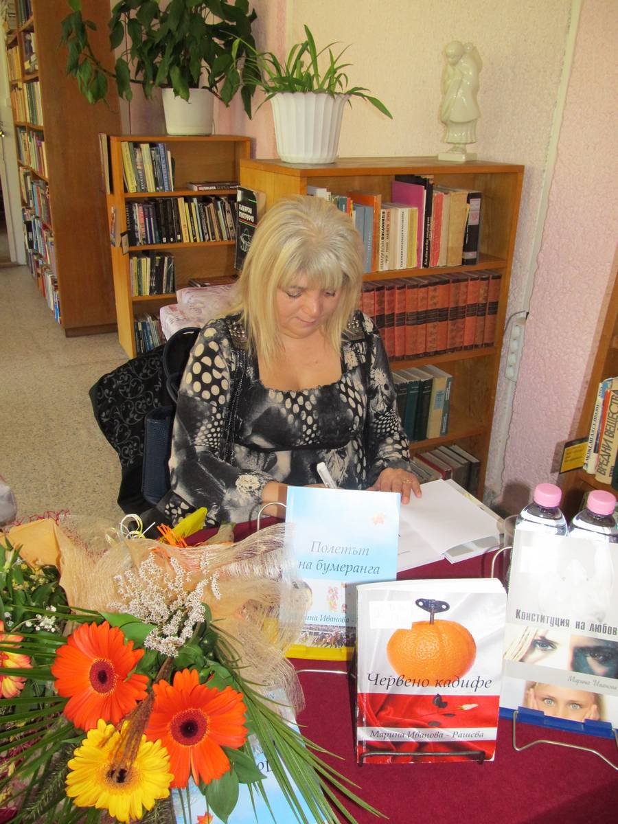 Лясковчани с интерес чуха експозето на презентатора Милена Маринова за трилогията със заглавия на трите книги „Конституция на любовта”, „Червено кадифе” и „Полетът на бумеранга”. Авторката с удоволствие отговори на всички въпроси, свързани с книгата и лични такива и сподели колко добре се чувства в красивия Лясковец. Своите дълбоки впечатления от трилогията разкри и главният библиотекар: „Разлиствайки началните страници на трилогията, първото нещо, което впечатлява читателя е семплият език на авторката и елегантния й стил на повествование. Трилогията проследява една вълнуваща история, в която се преплитат множество житейски съдби, изпъстрени със срещи, раздели, любов, съдбовни избори, раждания, убийства и много драматични обрати. Сюжетът на трите книги повежда читателя в един сложен лабиринт, в който се редуват тъмни, полутъмни и светли коридори. И както лабиринтът предлага много възможности и посоки, така всеки един от героите трябва да направи своя житейски избор, тласкан от личните си субективни подбуди. Достигайки финала на трилогията, читателят решава, че вече е почти в края на този объркан лабиринт, но се оказва, че той отново се е върнал в изходна позиция. Началото е не само отправна, но и финална точка. Всичко това поражда размисли за цикличността, както в необятната вселена, така и в обикновения човешки живот. Просто така е устроен света, че всяко начало има край и всеки край е ново начало. Авторката провокира читателя към размисли, в които изникват въпроси какво е любовта, безсмъртна ли е тя, защо за нея понякога трябва де се плаща с грях или смърт, винаги ли е гибелна силната любов…”
