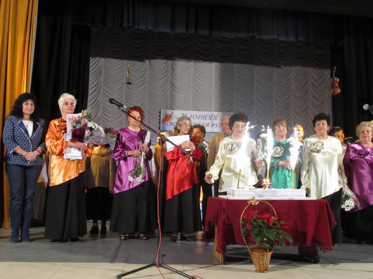 Кметът на Община Лясковец д-р Ивелина Гецова и председателят на лясковското читалище Васил Русев ги поздравиха, пожелавайки им още дълги години да събират лясковчани около сцената и творческият дух и вдъхновението никога да не ги напускат. Свещичките на голяма торта, украсена с бели ружи, подарък от д-р Гецова, духнаха на сцената всички заедно, пожелавайки си здраве и на многая лета. А докато свещичките горяха, публика и приятели пяха заедно с празнуващите.