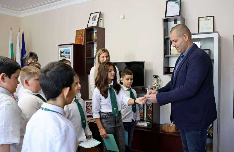 Силен интерес в децата предизвикаха и символите на града – ключа, кметската огърлица, герба, знамето, Почетната книга. Секретарят на Общината Емилия Иванова им показа и Алеята на кметовете, а началникът на отдел ГРАО Николай Марков разясни каква е работата на служителите в информационния център, показа им стария регистър с актове и още много интересни документи, които се издават в отдел „Гражданско състояние“.