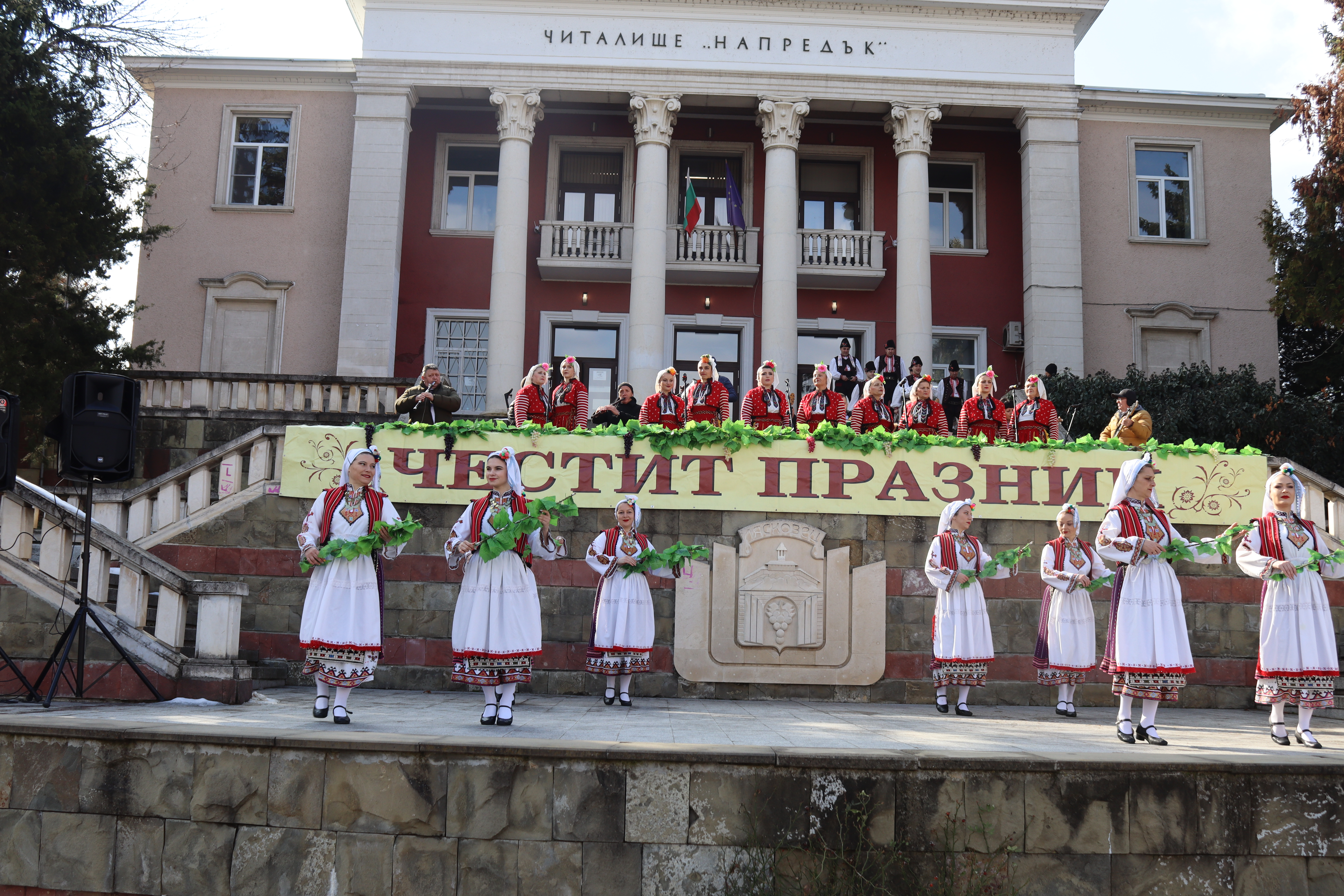Докато гостите от Лудогорието увличаха в танци празнуващите, за повдигане на настроението, се лееше и руйно вино – подарък от собственика на „Тотал-Вини“ за празника.
