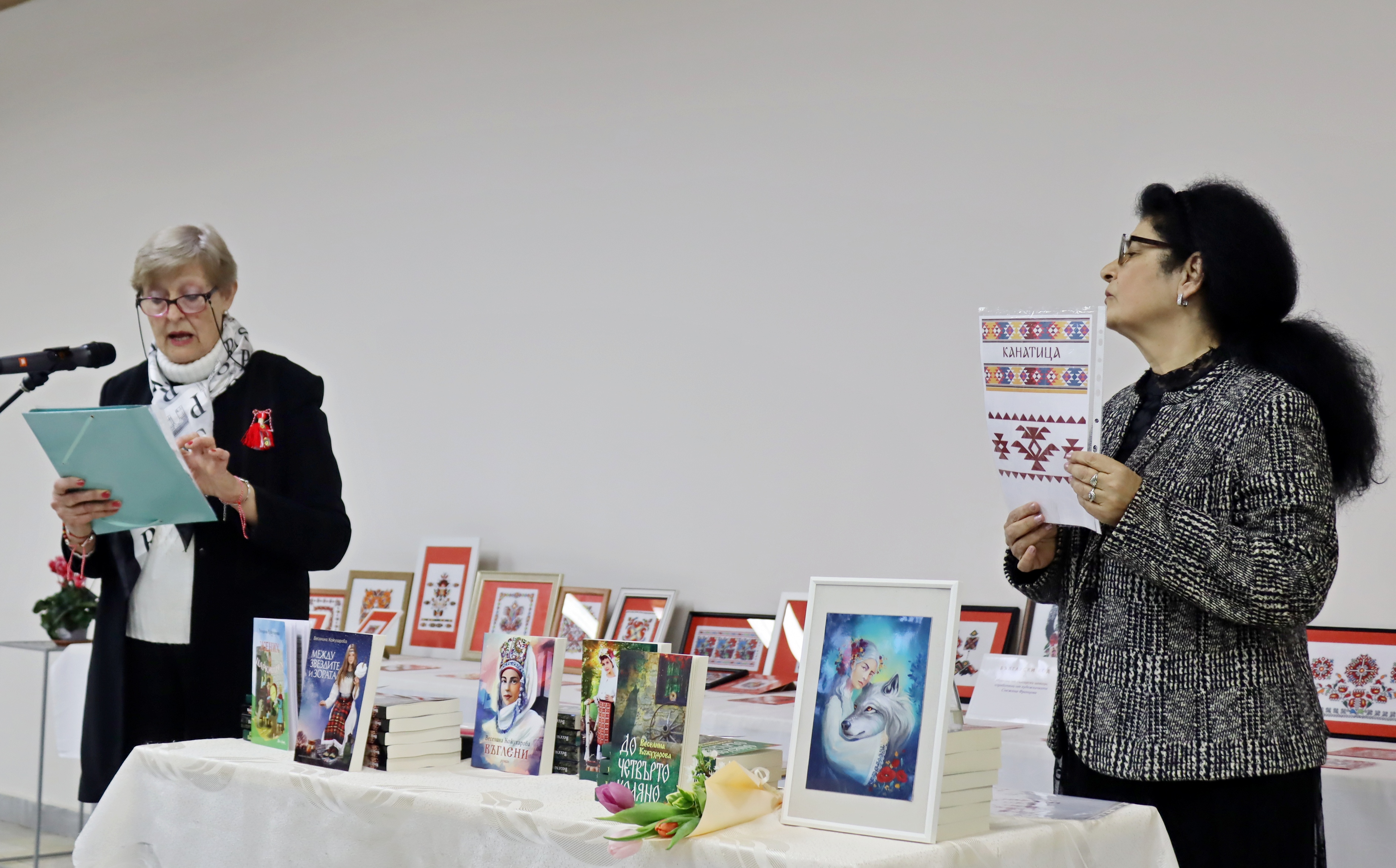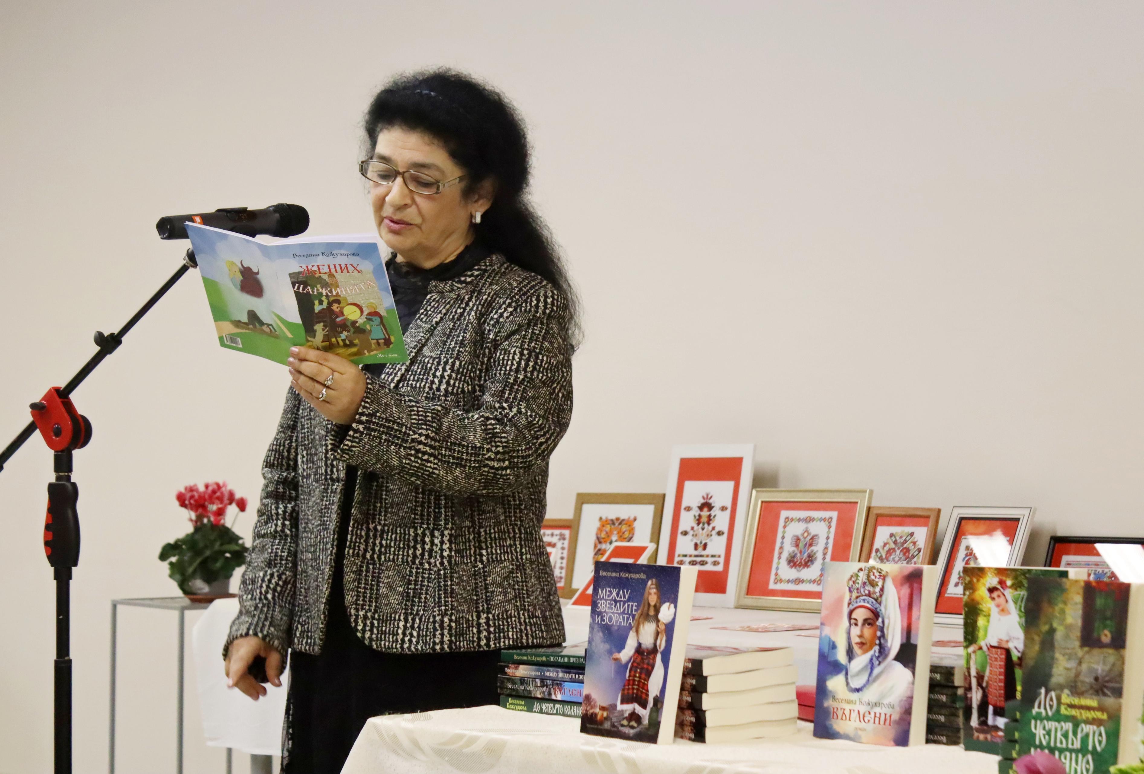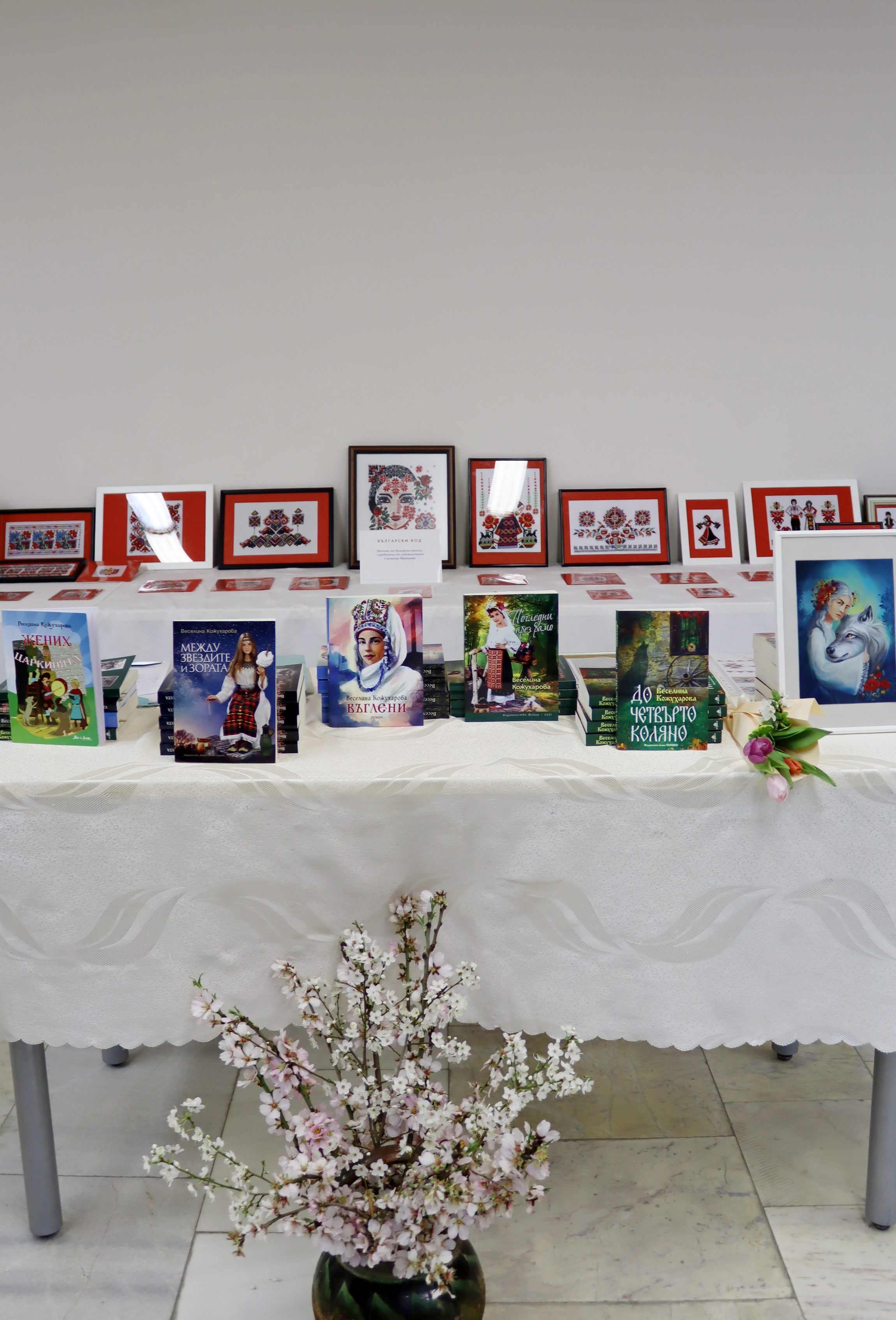 На фона на красивите бродерии, бяха подредени и книгите на авторката Веселина Кожухарова, която също е творец – пазител на българщината, но под друга форма на изразяване. Веселина Кожухарова е позната на лясковската общественост като вокален педагог, учител в ДГ „Пчелица“. След пенсионирането си, се отдава на писане – има издадени пет книги, в които умело преплита многоликите пъстри нишки на фолклора с богатата душевност на българите. Издава първо автентичната приказка „Жених на царкинята“, а за две-три години се появяват и книгите й „Погледни през рамо“, „Между звездите и зората“, „Въглени“ и „До четвърто коляно“. Последния й литературен труд „До четвърто коляно“ пред присъстващите представи филологът Теодора Миновска, а самата Кожухарова чете най-впечатляващи откъси от творчеството си. Романът й „До четвърто коляно“ запознава читателя с четири поколения жени, белязани от необикновени способности. Образите на жените са многопластови, а сюжетът мелодично разкрива трудните им съдби. Действието се развива преди Освобождението на България и малко след това, като във всяка глава от книгата бавно и постепенно се разкриват образите на знахарката Мавруда и нейните потомци. Всяко поколение от жени наследява дарби – да разгадават сънища, да чуват гласовете на мъртвите. Дарби, дошли от природата и от Бога, от вярата, грижата и прошката. „До четвърто коляно“ е книга, която успява толкова нежно и мелодично да върне читателя във времена, които на повечето млади дори не са познати, но те със сигурност принадлежат на всички нас и ние принадлежим на тях, защото все пак сме потомци – коляно на един български род. И точно върху това в романа си е наблегнала писателката – синтезирала е едно внушително послание: дълг към приемственост на българските духовни стойности и дълг към опазване на родолюбието. Писан в стила на автентичния български дух от онова време, с използвани диалекти, остарели думи и думи с рядка употреба, романът засяга няколко теми – важни и актуални и днес: човешките добродетели, прошката, обичта, но и омразата, алчността, сребролюбието, греховете. С размаха на талантлив писател, Веселина Кожухарова успява да ни предаде значението на принадлежността към рода, вярата в Бога и търсенето на доброто в живота.