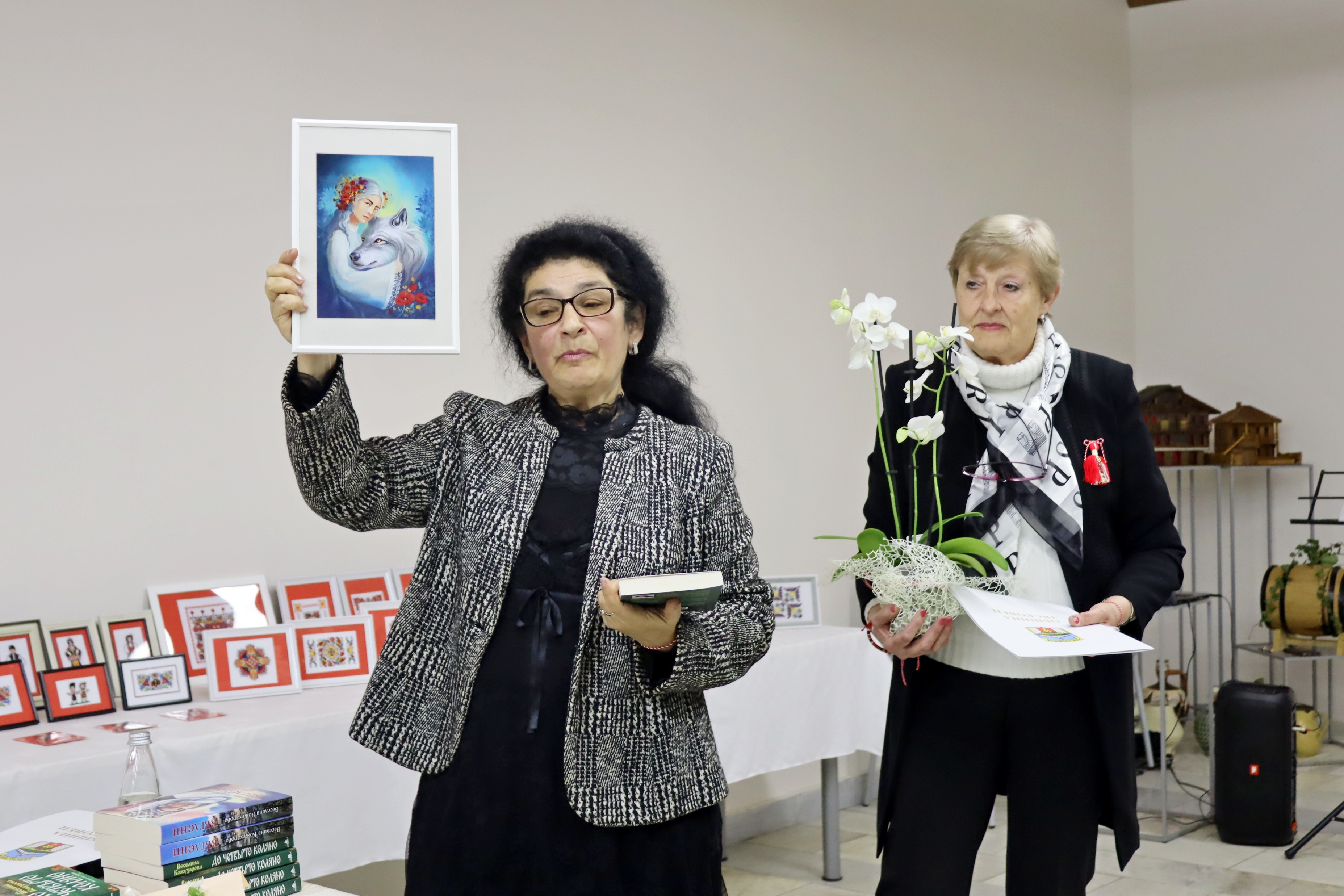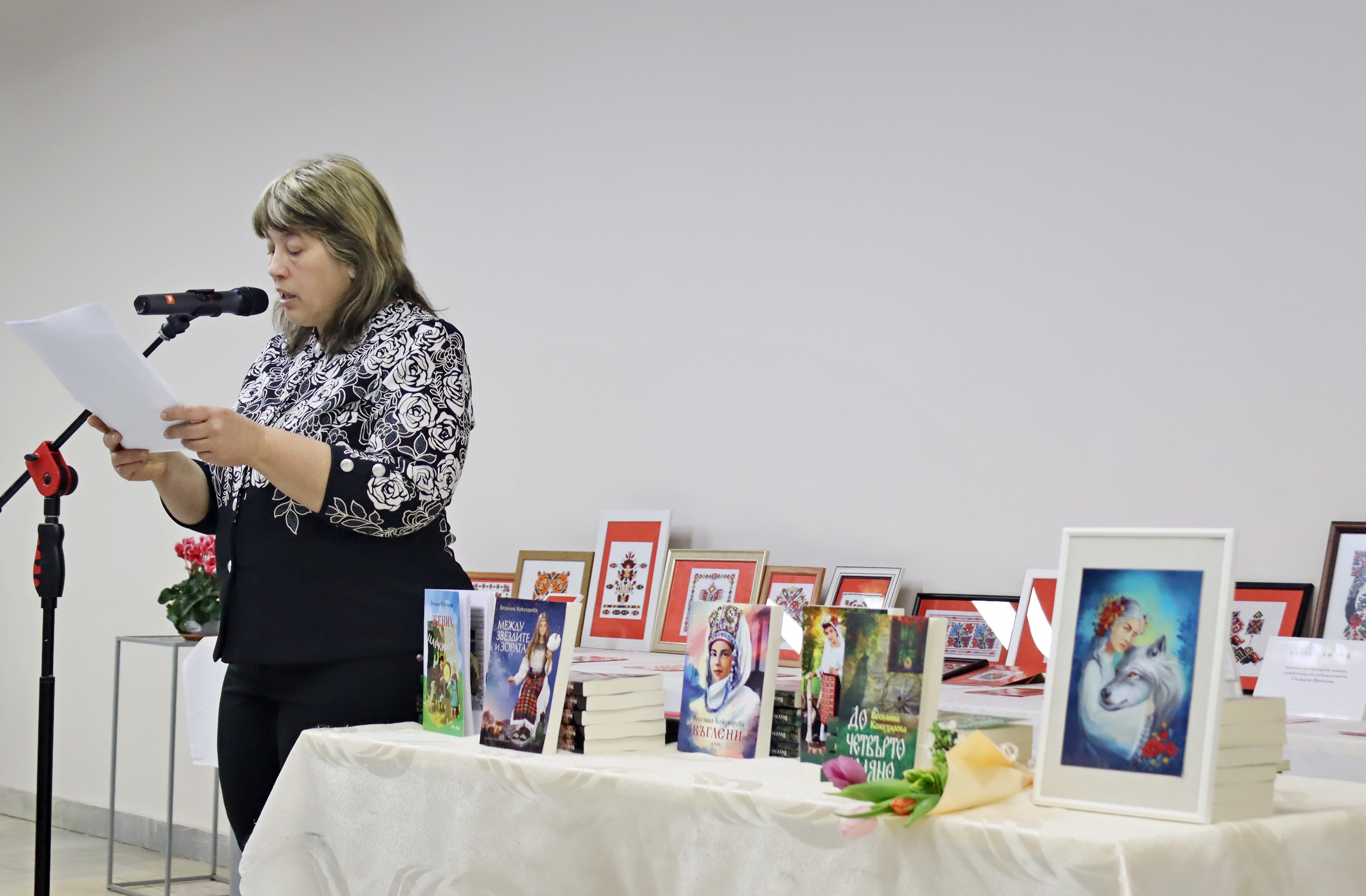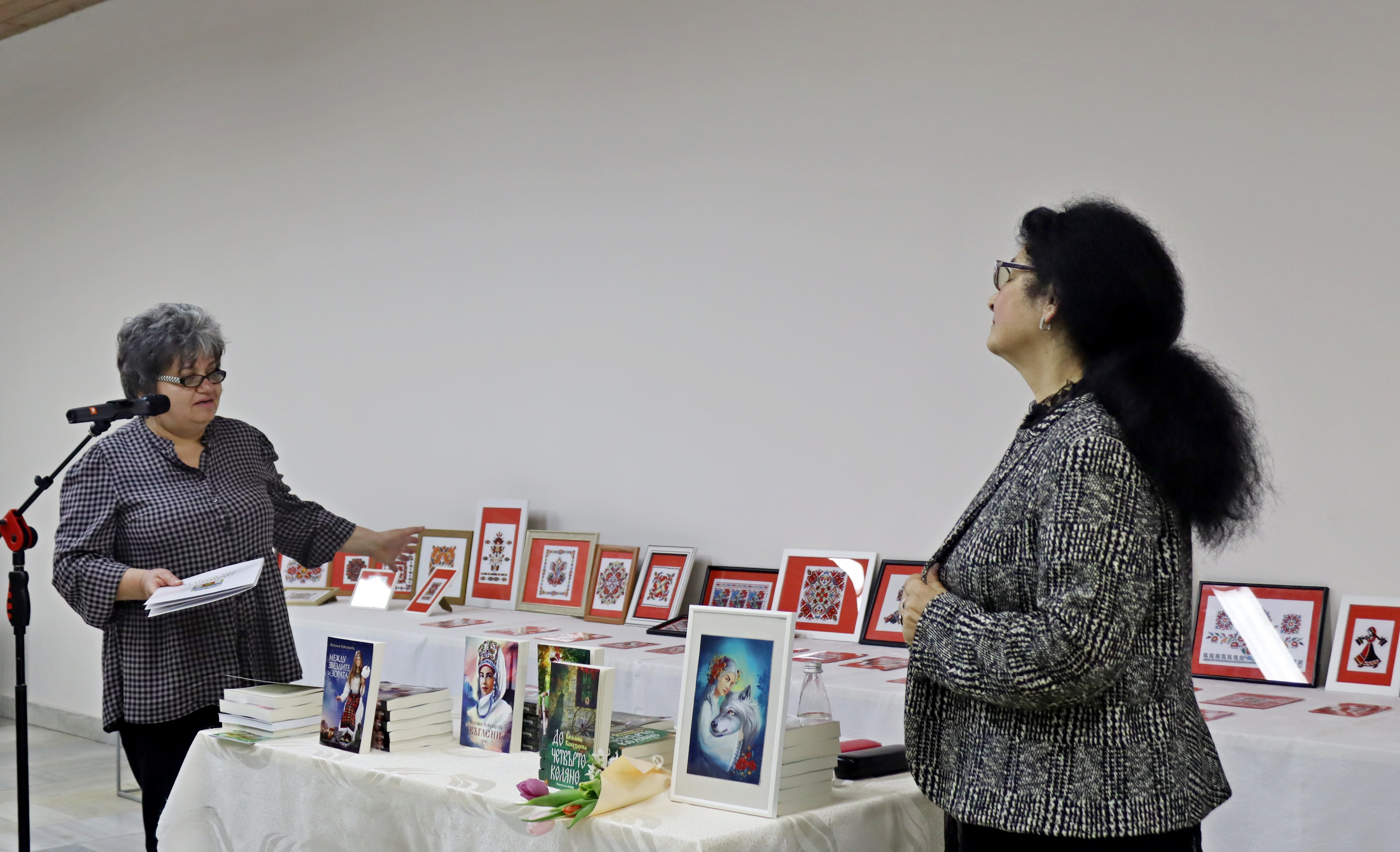 На фона на красивите бродерии, бяха подредени и книгите на авторката Веселина Кожухарова, която също е творец – пазител на българщината, но под друга форма на изразяване. Веселина Кожухарова е позната на лясковската общественост като вокален педагог, учител в ДГ „Пчелица“. След пенсионирането си, се отдава на писане – има издадени пет книги, в които умело преплита многоликите пъстри нишки на фолклора с богатата душевност на българите. Издава първо автентичната приказка „Жених на царкинята“, а за две-три години се появяват и книгите й „Погледни през рамо“, „Между звездите и зората“, „Въглени“ и „До четвърто коляно“. Последния й литературен труд „До четвърто коляно“ пред присъстващите представи филологът Теодора Миновска, а самата Кожухарова чете най-впечатляващи откъси от творчеството си. Романът й „До четвърто коляно“ запознава читателя с четири поколения жени, белязани от необикновени способности. Образите на жените са многопластови, а сюжетът мелодично разкрива трудните им съдби. Действието се развива преди Освобождението на България и малко след това, като във всяка глава от книгата бавно и постепенно се разкриват образите на знахарката Мавруда и нейните потомци. Всяко поколение от жени наследява дарби – да разгадават сънища, да чуват гласовете на мъртвите. Дарби, дошли от природата и от Бога, от вярата, грижата и прошката. „До четвърто коляно“ е книга, която успява толкова нежно и мелодично да върне читателя във времена, които на повечето млади дори не са познати, но те със сигурност принадлежат на всички нас и ние принадлежим на тях, защото все пак сме потомци – коляно на един български род. И точно върху това в романа си е наблегнала писателката – синтезирала е едно внушително послание: дълг към приемственост на българските духовни стойности и дълг към опазване на родолюбието. Писан в стила на автентичния български дух от онова време, с използвани диалекти, остарели думи и думи с рядка употреба, романът засяга няколко теми – важни и актуални и днес: човешките добродетели, прошката, обичта, но и омразата, алчността, сребролюбието, греховете. С размаха на талантлив писател, Веселина Кожухарова успява да ни предаде значението на принадлежността към рода, вярата в Бога и търсенето на доброто в живота.
