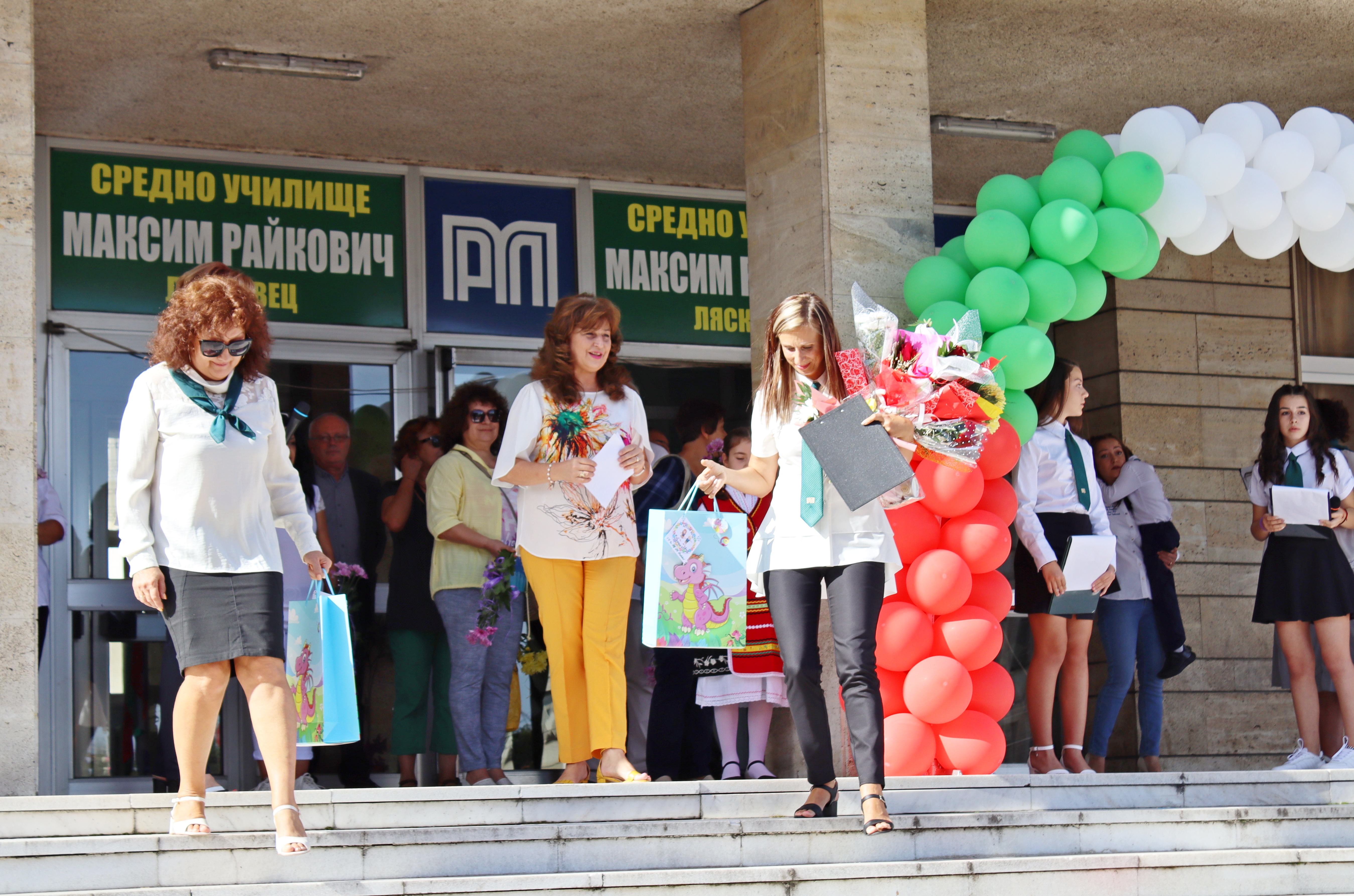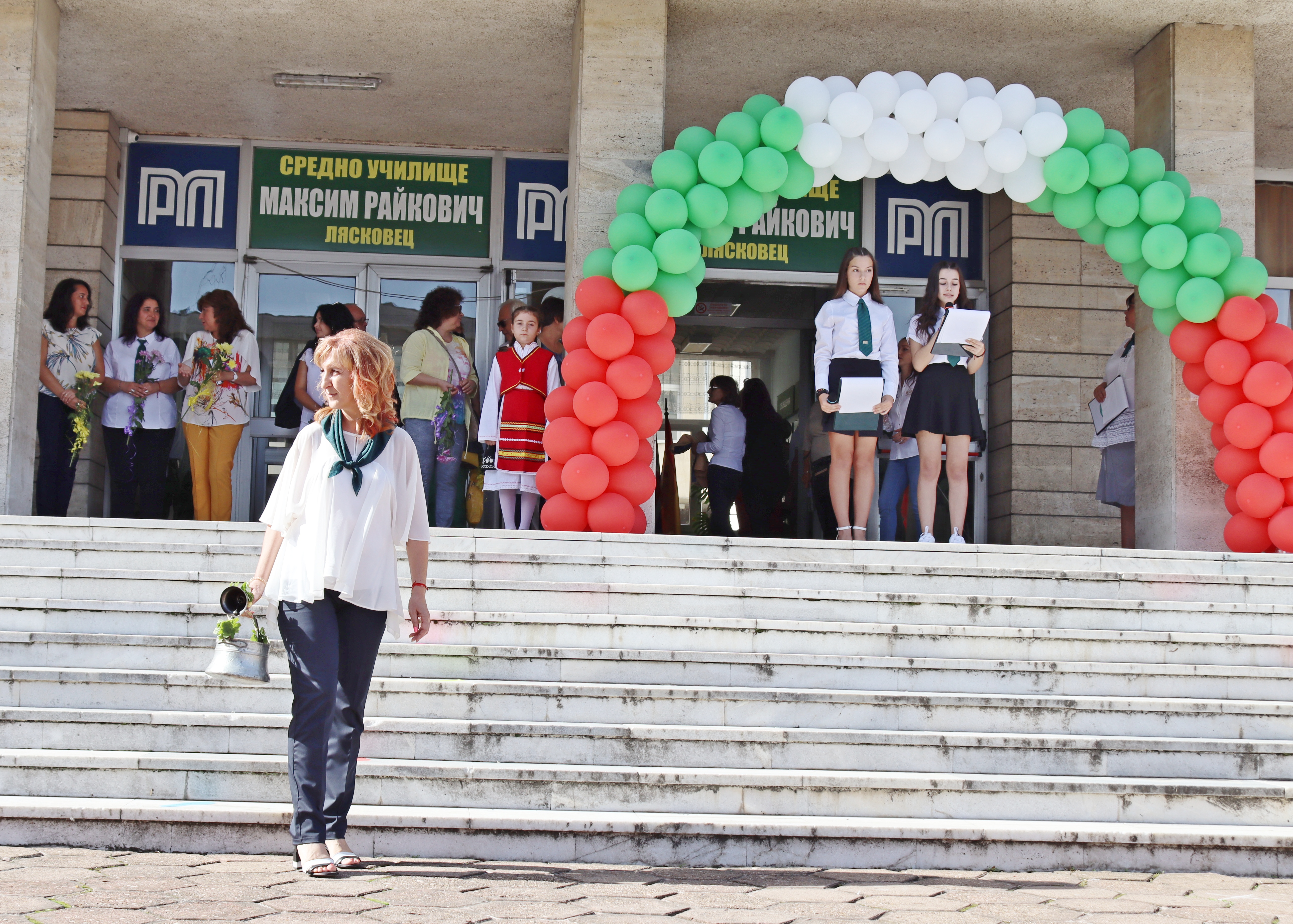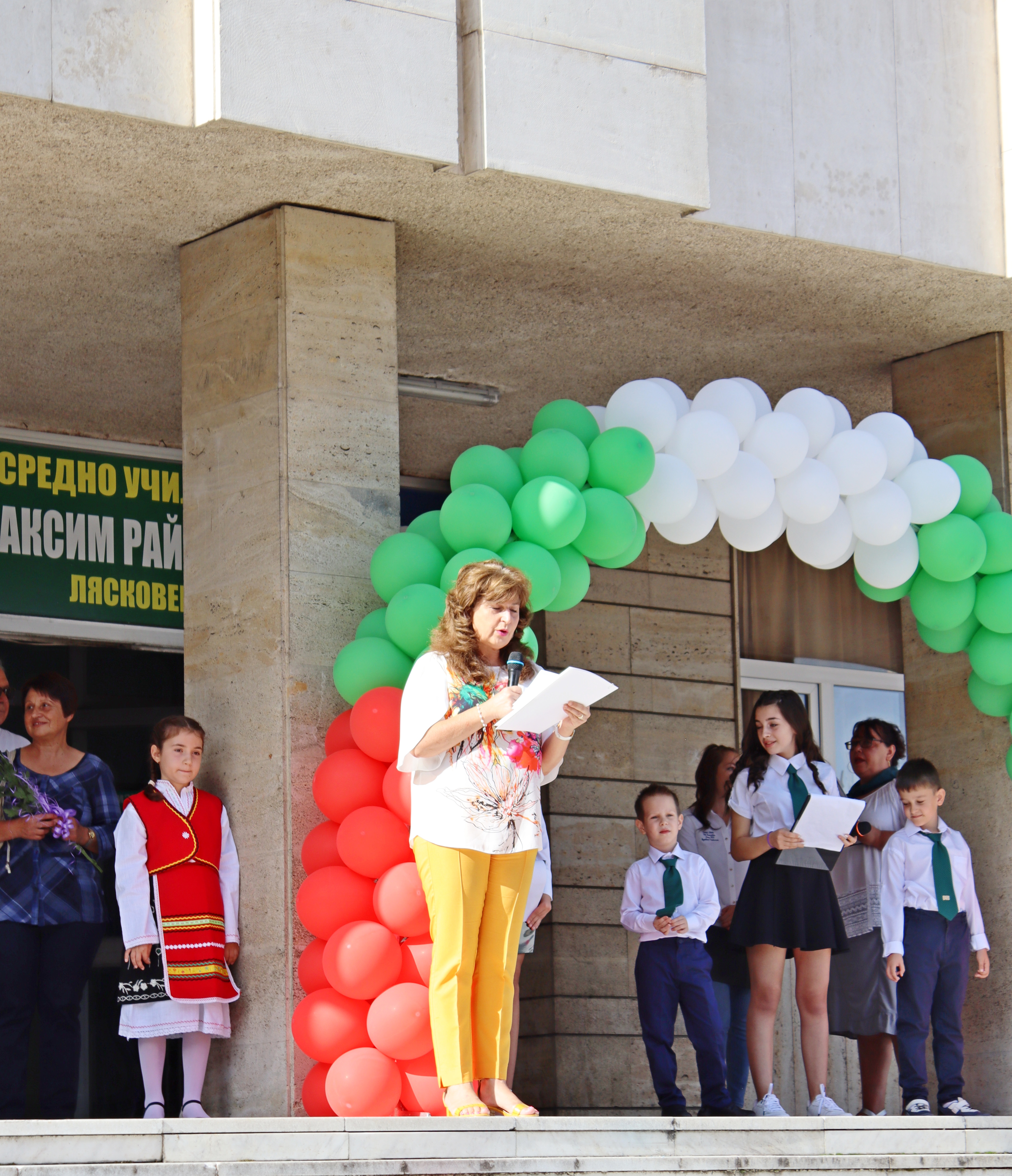 В своето приветствие към учители, ученици и родители Даниела Арабаджиева – директор на гимназията, пожела здрава, успешна и ползотворна учебна година. С плисване на менче с вода и с биене на училищното звънче, тя прикани първокласниците да пристъпят училищния праг с пожелание за много приятни моменти в необятните простори на знанието. На празненството приветствие към учениците отправи и специалният гост – кметът на Община Лясковец д-р Ивелина Гецова. Тя призова: Скъпи учители, продължавайте смело да водите децата напред, учете ги да се изправят, когато се препъват, показвайте им верния изход измежду лабиринта от житейски препятствия и ги водете по пътя към светли върхове! Искам да Ви пожелая, скъпи ученици упоритост, за да постигате целите си. Решителност, за да сбъдвате мечтите си! Търпение и воля, за да си помагате и да се насърчавате един друг. И не забравяйте, че образованието е един от най-важните елементи на човешкия живот и вие сте продължителите на нашите възрожденски традиции, вие сте гордостта на съвременниците в този известен с прогресивното си мислене роден наш Лясковец! Бъдете здрави, успешни и целеустремени! На добър час!“.