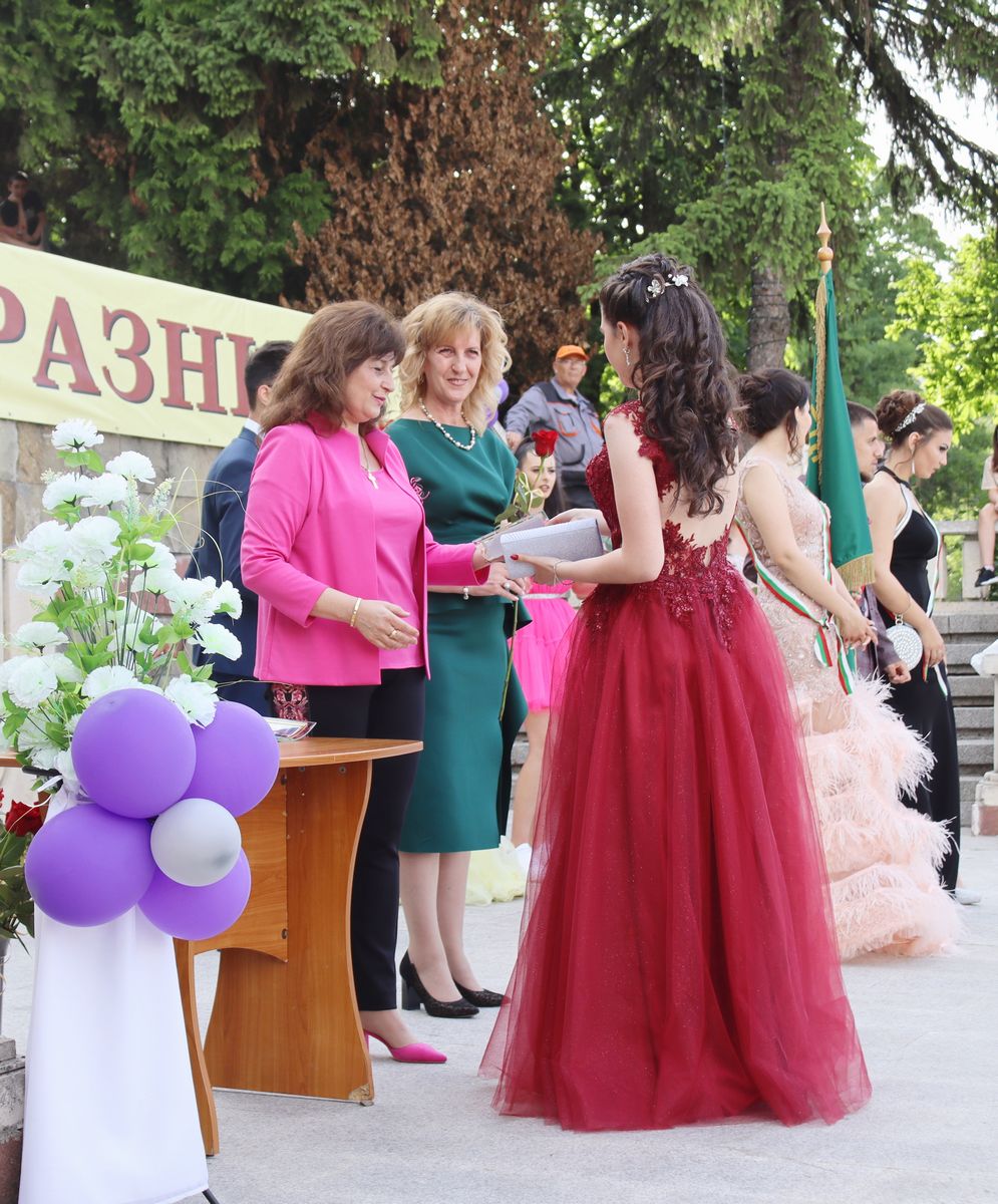 И тази година емоцията беше върховна, както за момичетата и момчетата от СУ „Максим Райкович“, така и за техните родители, учители и за всички лясковчани. Пред пъстроцветна арка с питка на ръце по стар български обичай, ги срещаше техният класен ръководител Марина Костадинова, за да ги изпрати в прекрачването прага на новото училище, наречено Живот. Учителката им – старши учител по математика, информатика и информационни технологии, ги изпрати с думите: „Нека символ на днешния ден да е слънцето, което носи светлина и топлина в живота ни. Всички мои ученици са лъчите на това слънце, които докосваха и стопляха душата ми през тези пет години. Понякога аз бях буреносен облак, но те винаги успяваха да ме превърнат в дъга. Всеки от тях е оставил частичка от себе си в моето сърце и аз няма да ги забравя. Дано и те да ме запомнят с добро!“. Към дванадесетокласниците от XII „а“ – профилирана паралелка с профил „Технологичен“, се обърнаха с поздрав и напътствия и директорът на училището Даниела Арабаджиева, и кметът на Общината д-р Гецова. Те пожелаха на зрелостниците успешно завършване на този етап от образованието им, успехи на кандидатстудентските изпити, заръчаха им да помнят родното училище и родния град, където и да се намират, и разбира се, пожелаха им прекрасна и незабравима бална нощ.