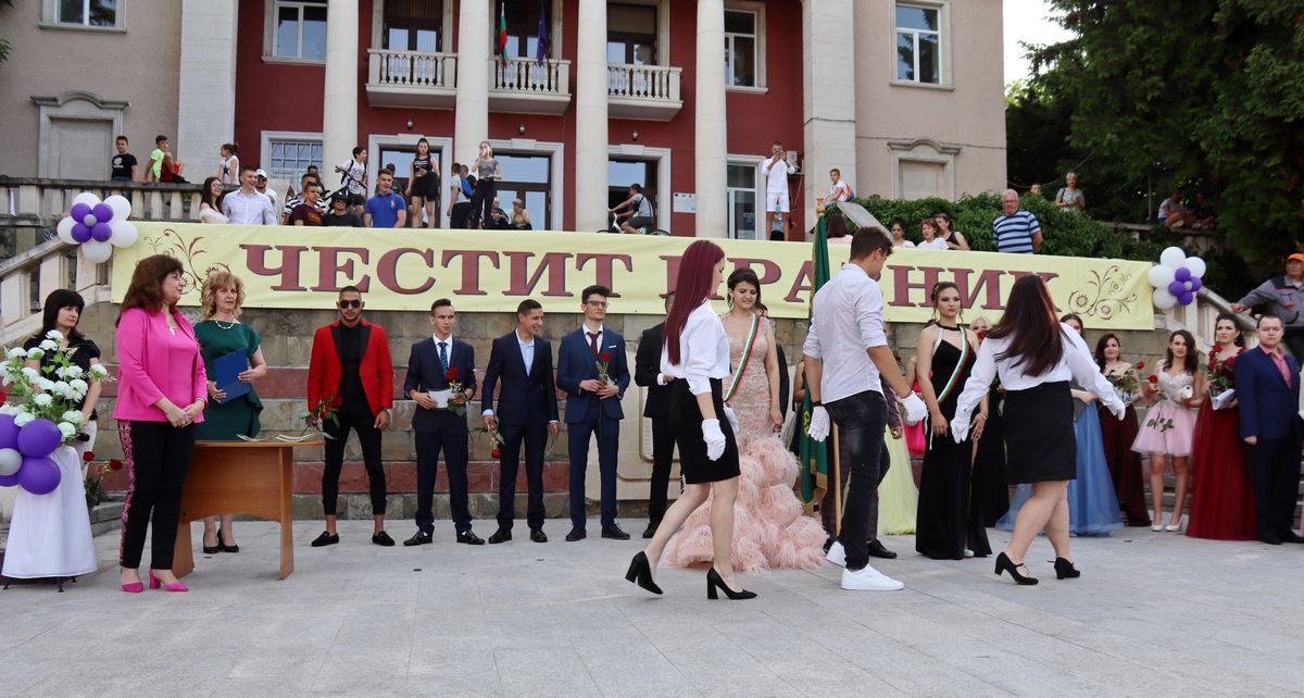 Плакети и цветя получи всеки един от тях, след което зрелостниците тържествено предадоха на единадесетокласниците знамето на училището.
