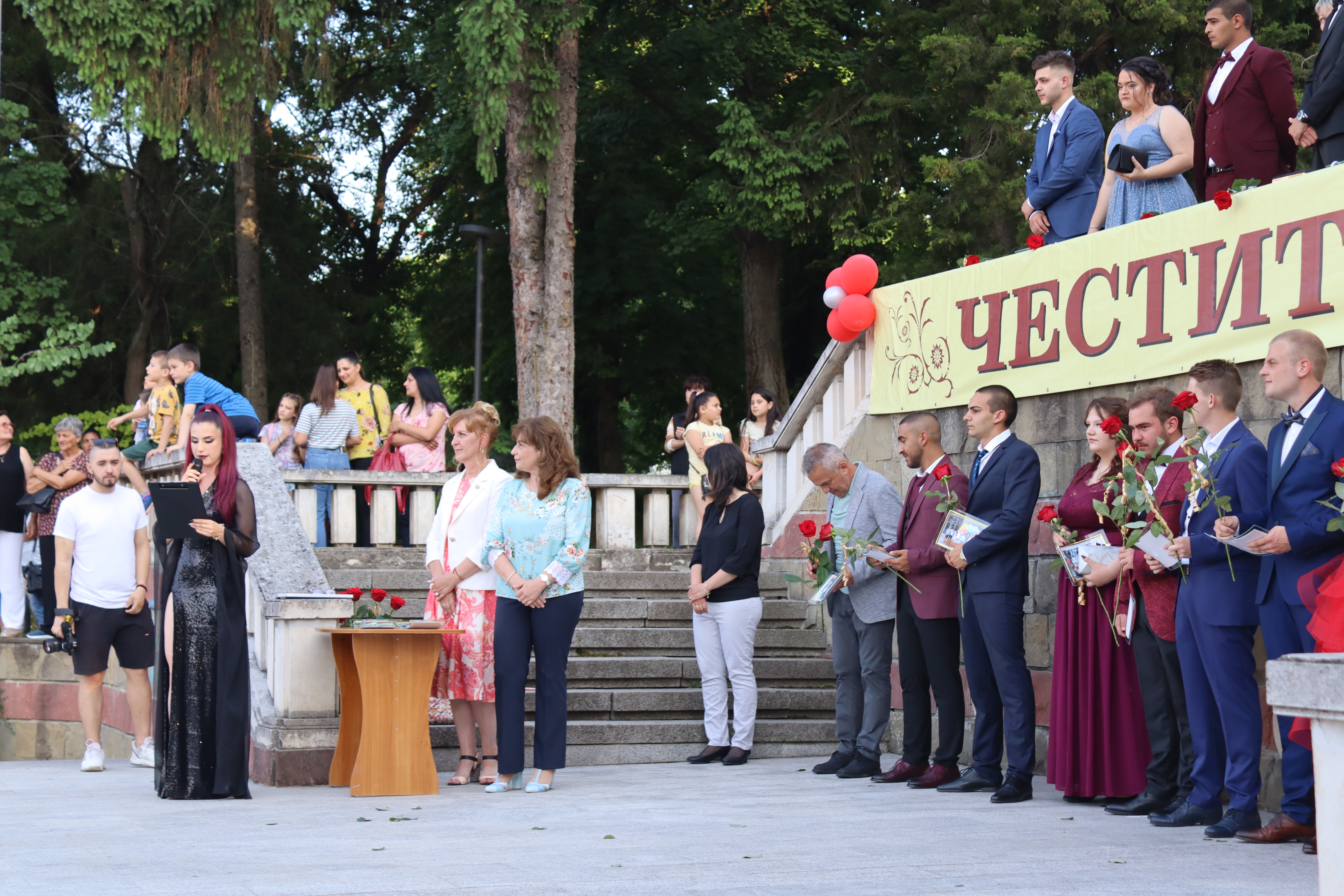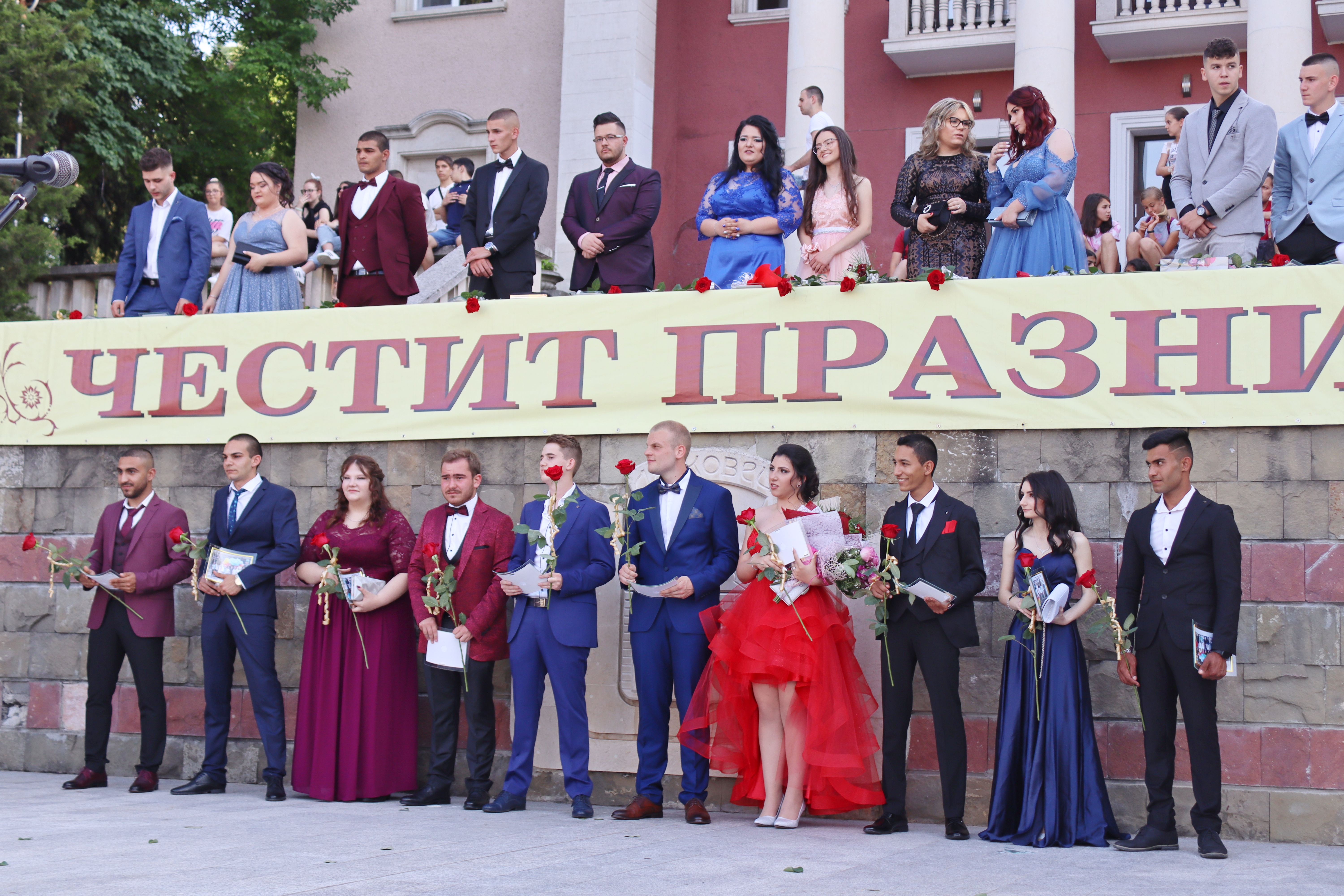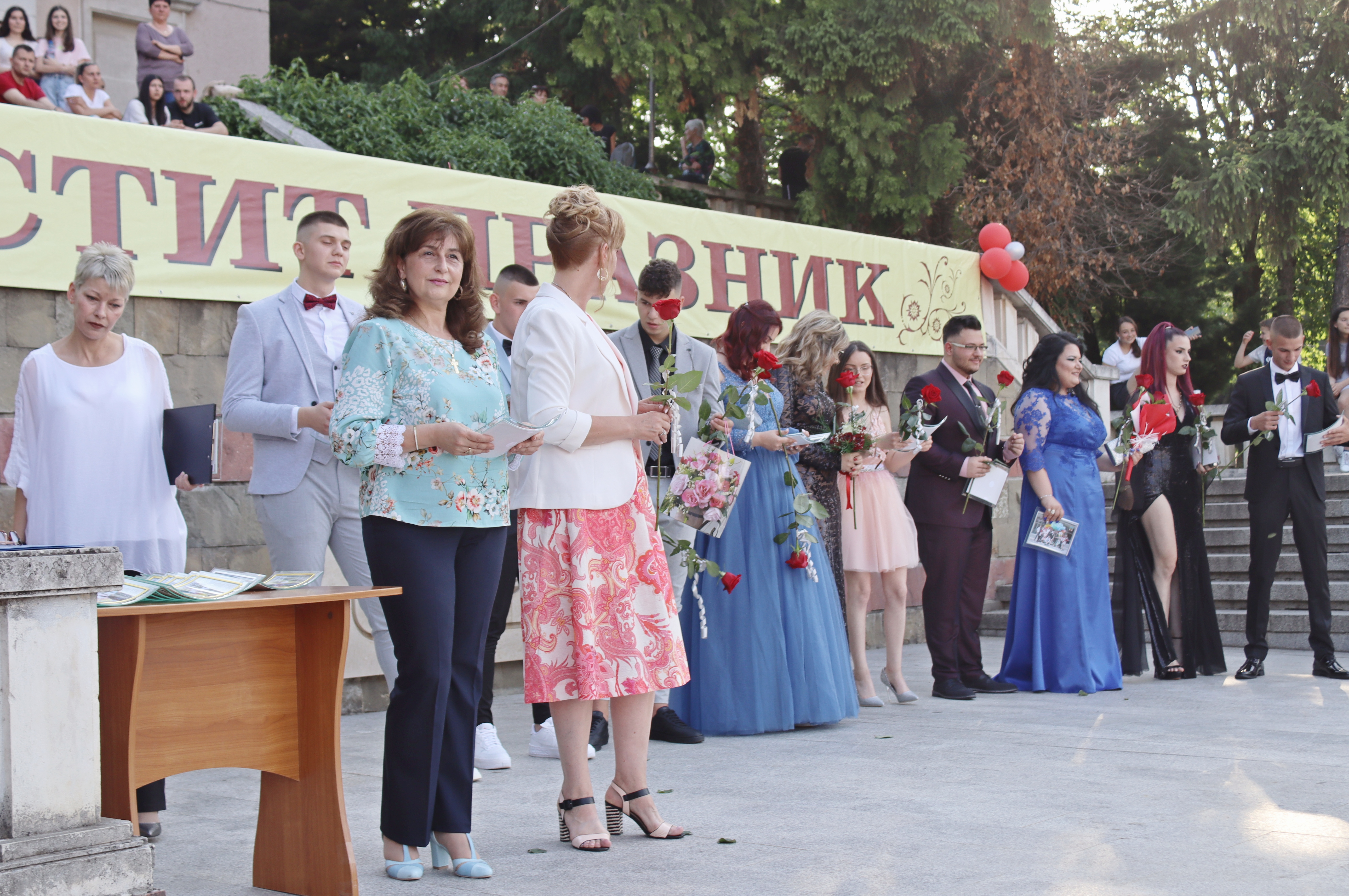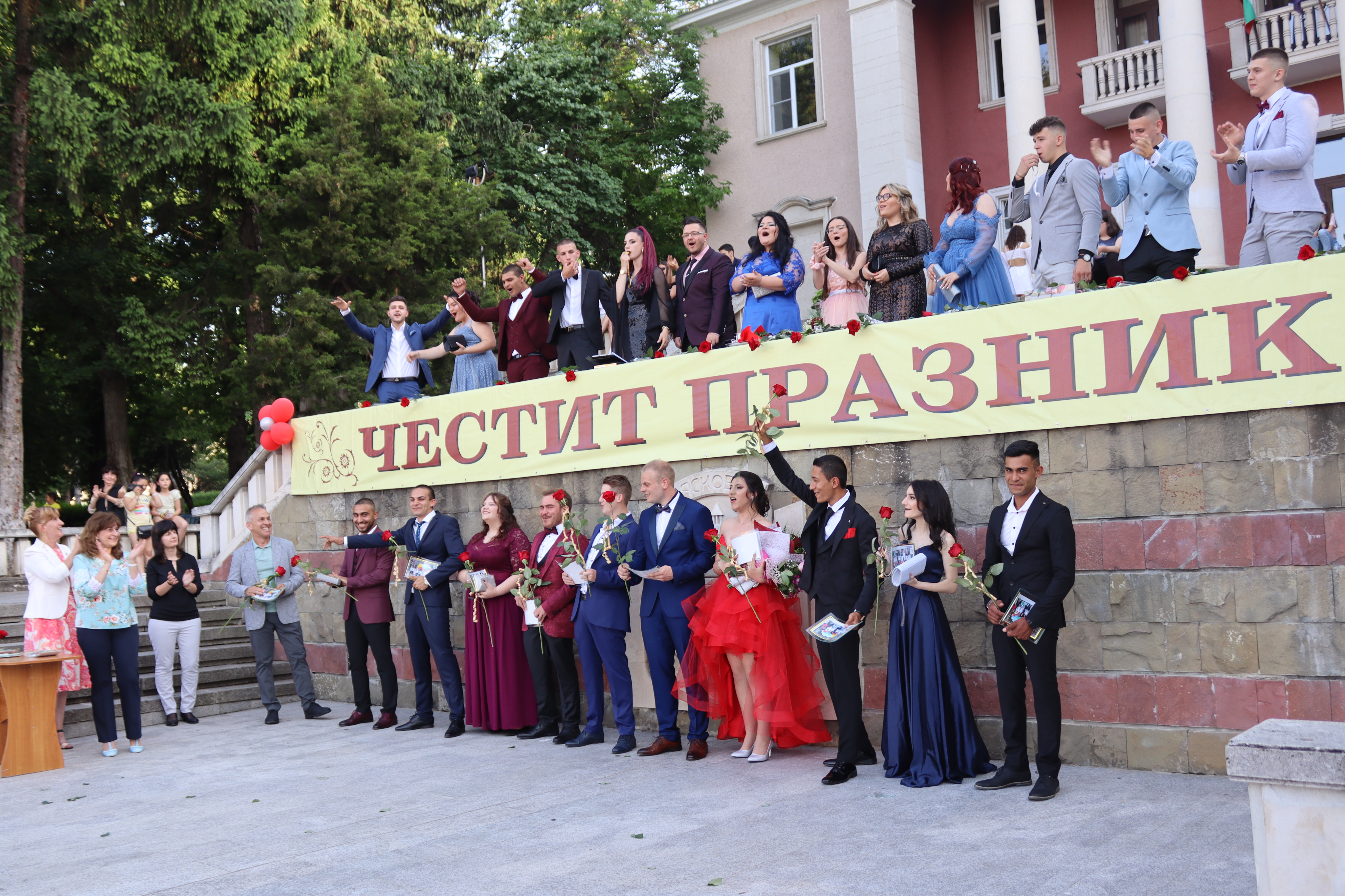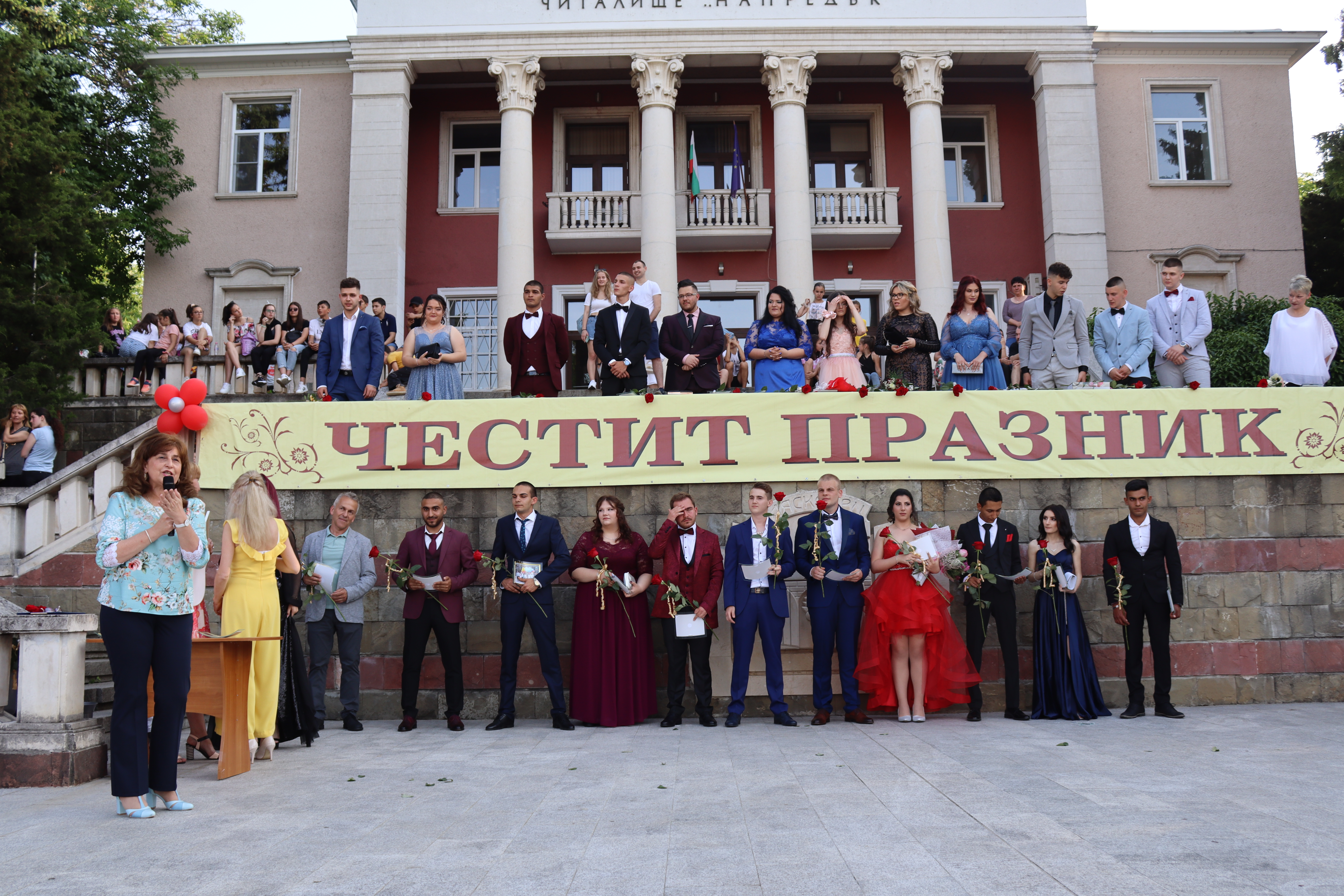На сцената кметът на общината д-р Ивелина Гецова и директорът на училището Даниела Арабаджиева посрещнаха порасналите момичета и момчета с цветя, плакети, прегръдки и благопожелания към всеки. Класните ръководители на двата класа Здравка Евтимова и Пламен Граматиков също дефилираха и споделиха емоцията със своите пораснали деца. На сцената всички бяха напътствани от директора и кмета, а от името на своите съученици, благодарност към общинското и училищното ръководства, към учителите и родителите, отправи абитуриентката от XII „А“ клас Йоанна Хубанова.