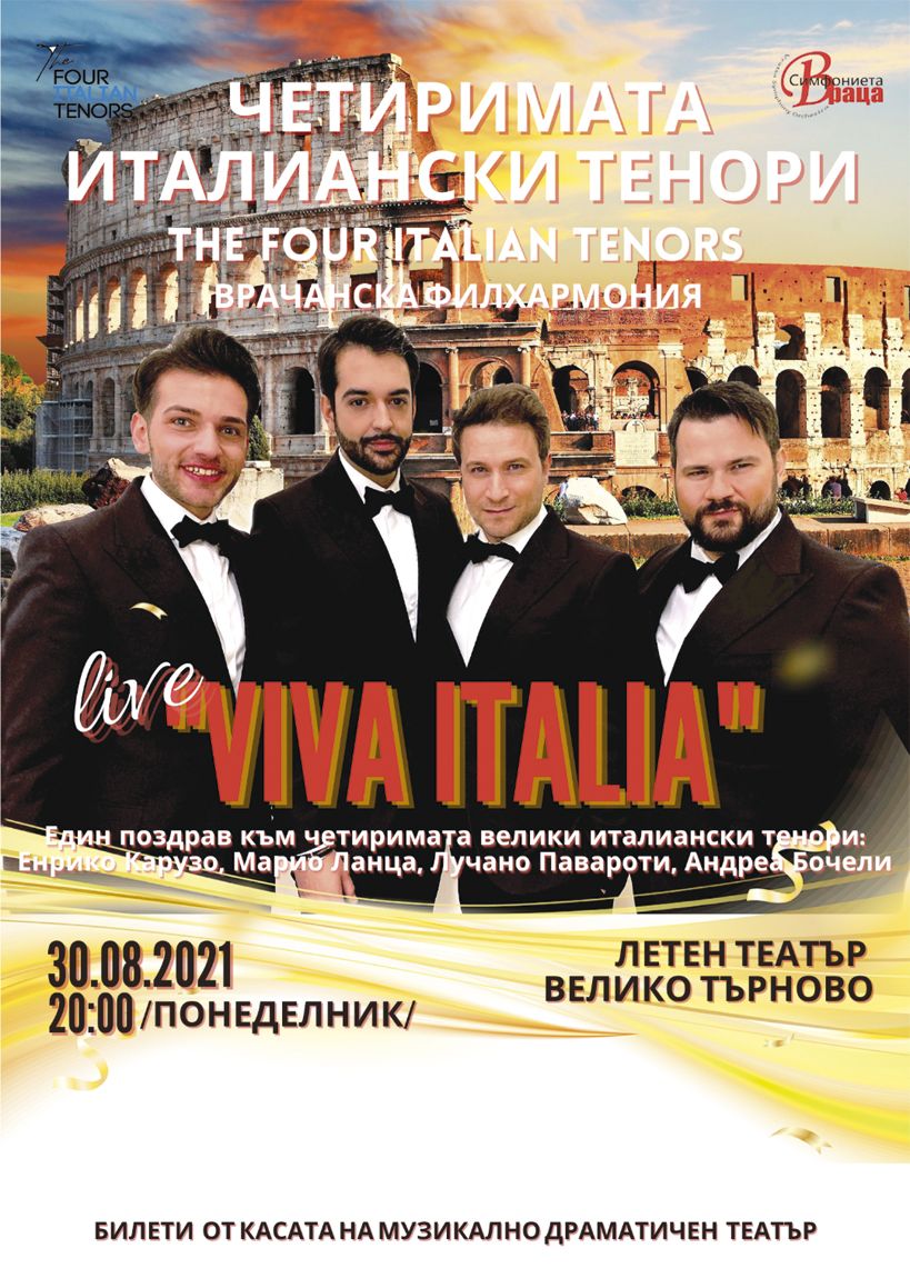 “Четиримата италиански тенори” пристигат във В. Търново със своя концерт-спектакъл “VIVA ITALIA”. Програмата включва популярни арии и канцонети, чрез които публиката в старата столица ще се докосне до магията на белкантото. Гостуването им в Летния театър на 30 август от 21 ч. е част от лятното турне на италианците в България, заедно със Симфониета-Враца, с диригент Христо Павлов.