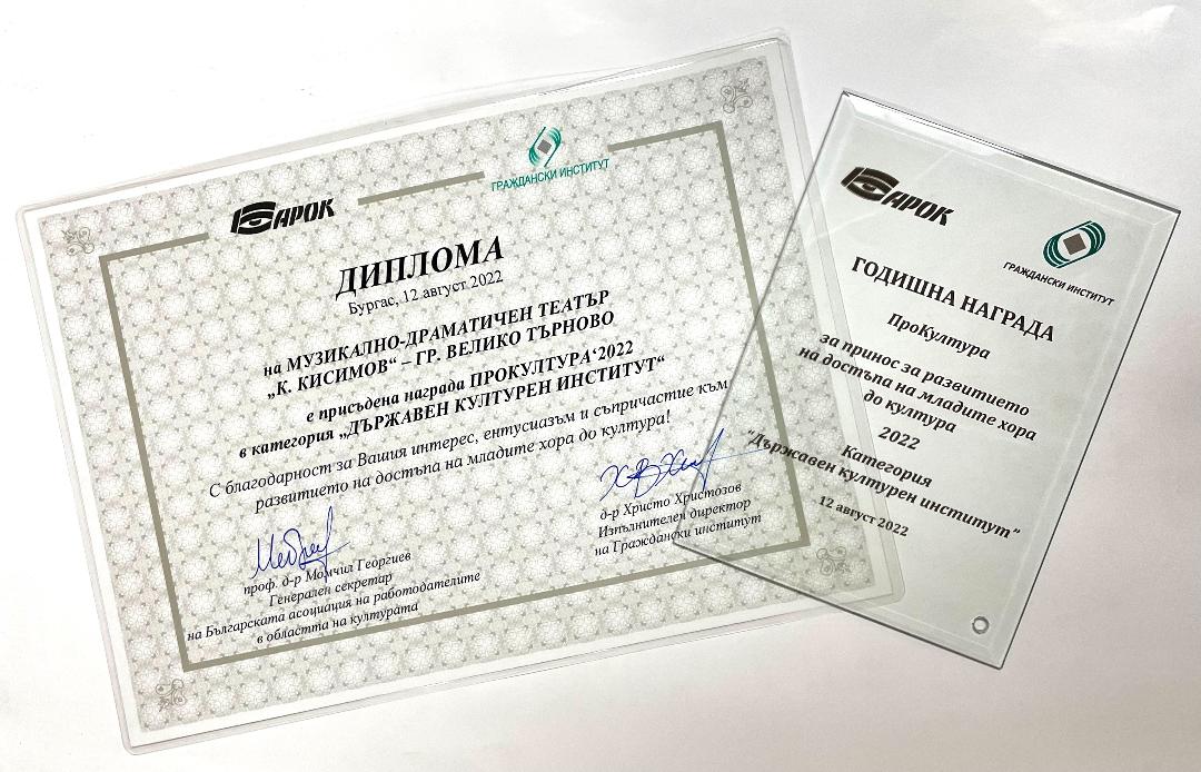 Великотърновският театър получи националната награда „ПроКултура“ за принос към разширяването на достъпа на младите хора до култура. Отличието е присъдено от Българската асоциация на работодателите в областта на културата (БАРОК) и Граждански институт. Директорът на Музикално-драматичният театър «Константин Кисимов» Васил Вълчев получи приза в категорията „Държавен културен институт“ за активна дейност с младежки и общински структури и училищата в града.