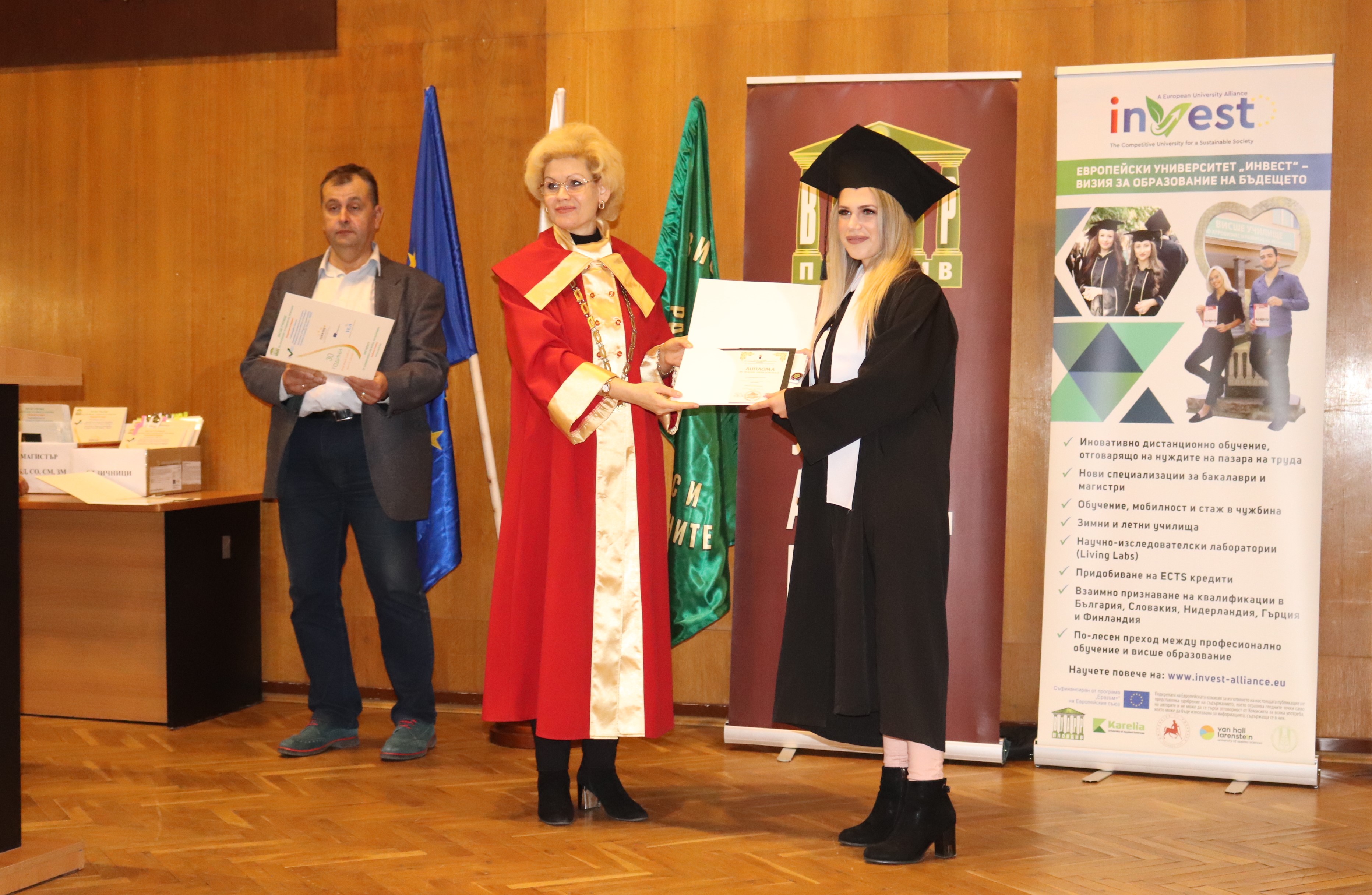 Президентът на ВУАРР връчи диплом с отличие, грамота и значка на 40 випускници, от които 20 с ОКС „бакалавър” и 20 с ОКС „магистър”. Първенец сред тях е Мария Кенарева, която завършва ОКС „бакалавър” със специалност „Стопанско управление” с отличен успех 5,89.