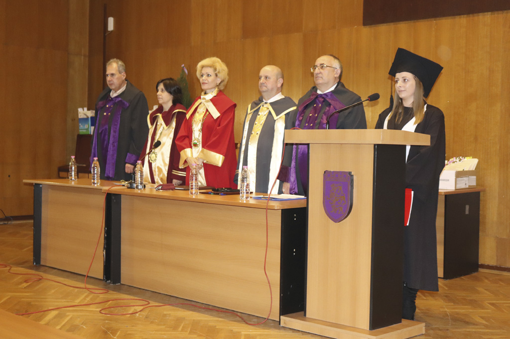 Благодарности от името на абсолвентите поднесе Теодора Иванова. Тя прочете и Галилеевата клетва – тържествено обещание за използване на науката единствено в името на хуманизацията на света, която всички нейни колеги повториха на глас.