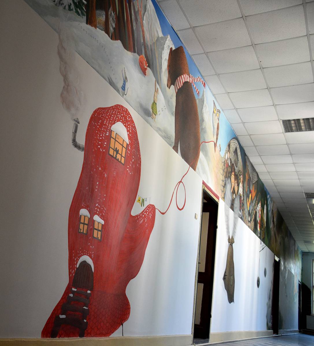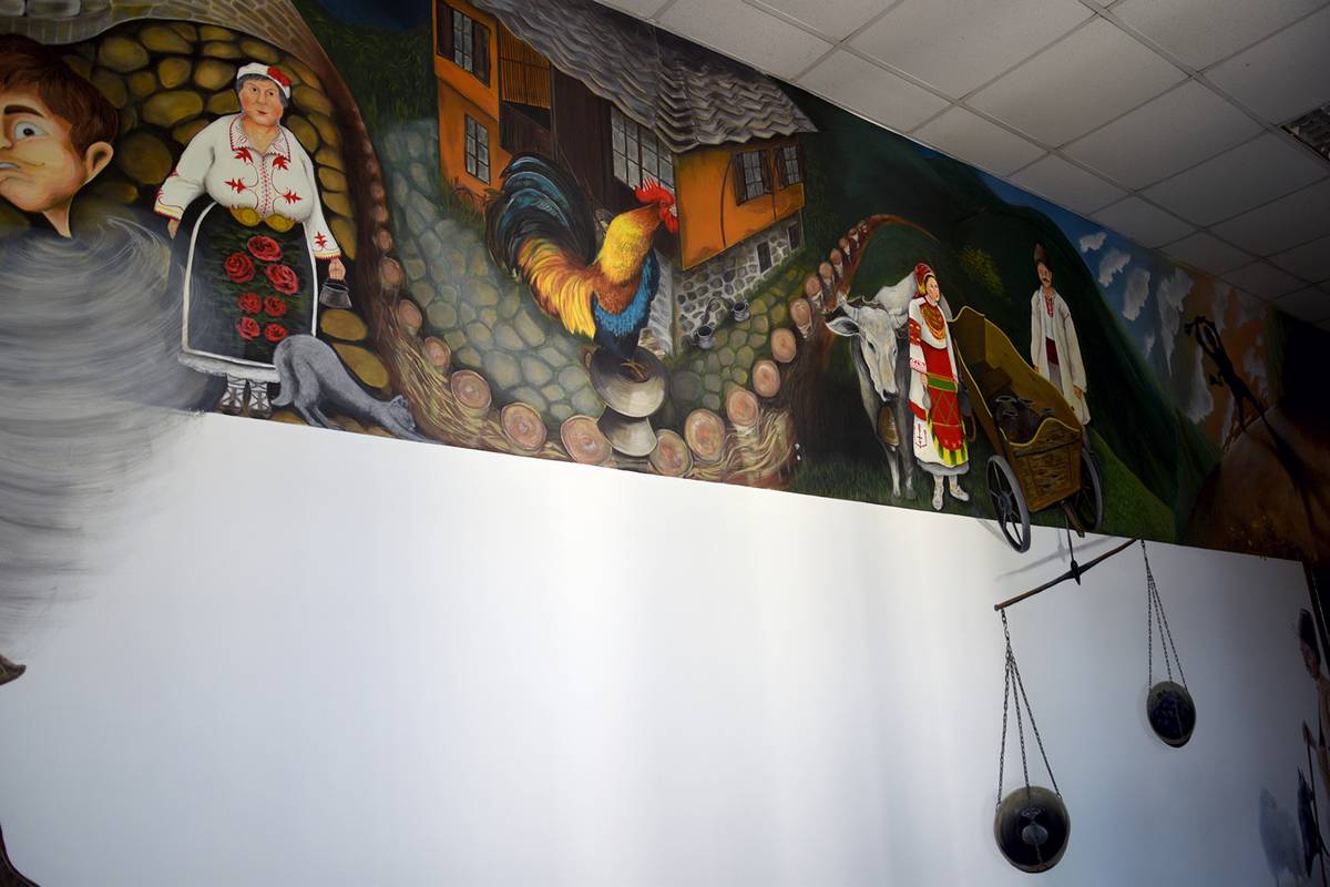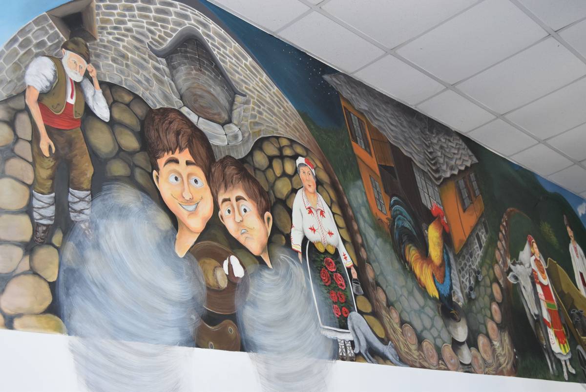 Творческият екип на водещия преподавател доц. д-р Владимир Аврамов и гл.ас. д-р Анастасия Тонкова – Гергана Йовчева, Цветина Цветанова, Радослав Тодоров, Айлин Ебазер, Евгени Болжеларский, Женя Калева и Калин Михов, пресъздадоха едни от най-популярните детски приказки на Елин Пелин, който е патрон на училището. Студентите са избрали да нарисуват герои от „Дядовата ръкавичка“, „Сливи за смет“, „Торбаланци“, „Ян Бибиян“ и други. Стенописната творба е с площ от близо 87 кв. м, а преобразяването на интериора е направено с техниката „а-секо“.