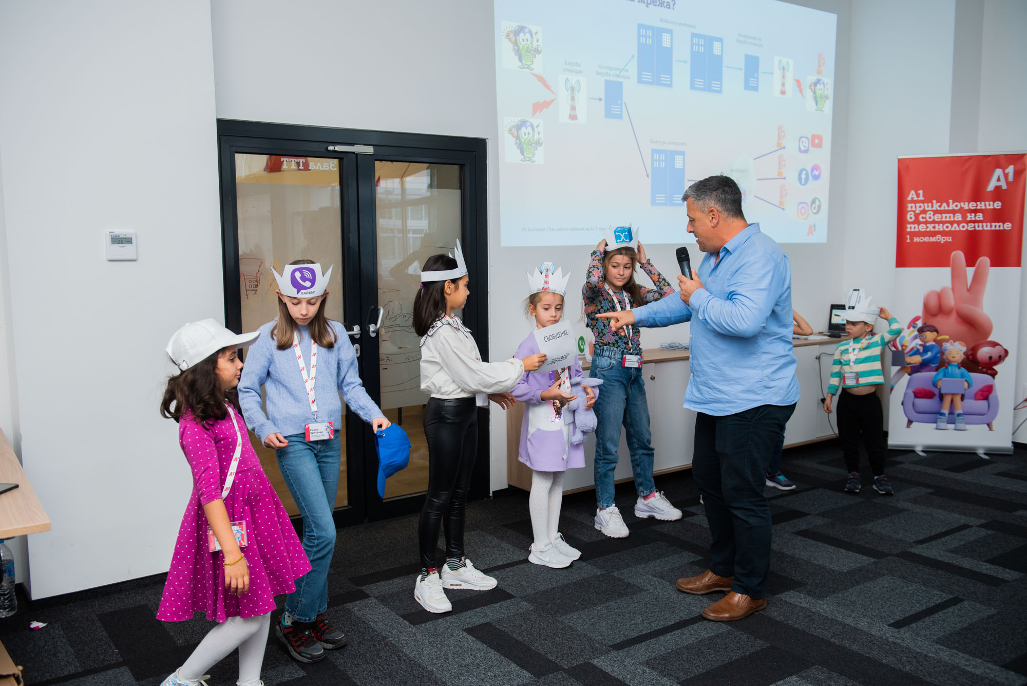 Специалисти от А1 се превърнаха в лектори, които представиха на малчуганите как функционира компанията и основните ѝ звена. Александър Петров, мениджър екип “Продукти, услуги и ОТТ партньорства за частни клиенти” разказа на децата за продуктовото портфолио и услугите, част от които свързани с интерактивна телевизия, пакетите за HBO MAX, както и Netflix, който вече е включен в ТВ плановете на А1. Веднага след него Ваня Данова, старши специалист в направление „Информационни технологии и дигитална трансформация“, представи IT проектите на компанията заедно със специална игра за децата, в която заедно организираха идеалния рожден ден. Емил Чаушев, старши инженер в направление „Мрежа и услуги“, въвлече малчуганите в друга игра, с която ги запозна с начина, по който функционира мрежата, думите и съобщенията, които изпращаме, и които преминават през базовата станция, за да достигнат до получателя отсреща.