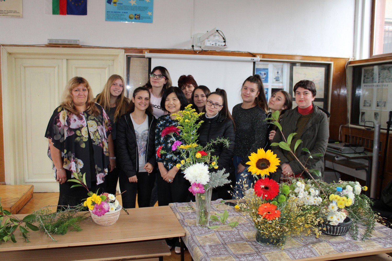 Чужденката демонстрира пред учениците различни видове икебана – традиционна, модерна и във висок съд. Младите хора от специалностите „Парково строителство и озеленяване“ и „Интериорен дизайн“ проявиха активност и изключителен интерес към това изкуство. Г-жа Сонеда се запозна с изработените икебани от деветокласниците от специалност „Парково строителство и озеленяване“ под ръководството на инж. Зоринка Попхристова и оцени високо таланта на учениците.