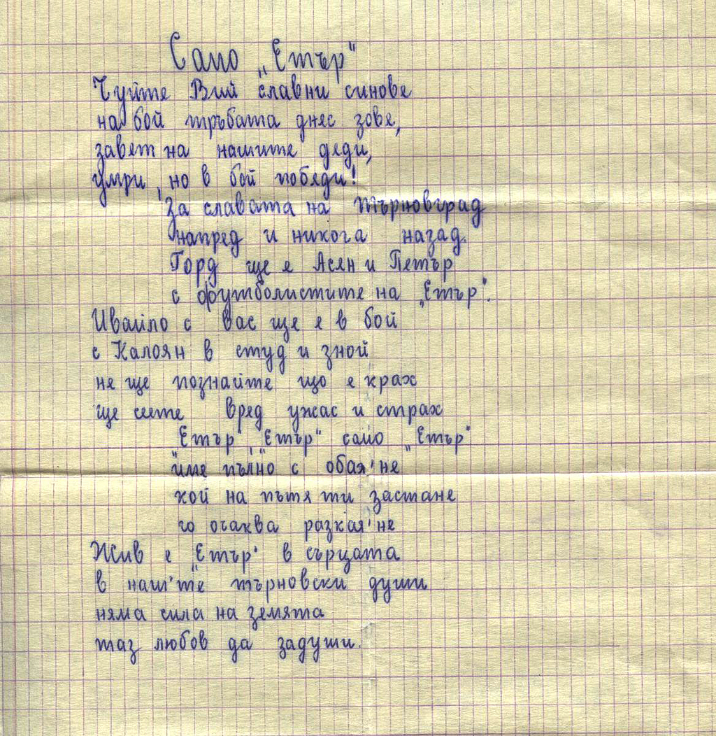 Двайсетте реда са римувани, но нямат никакви поетични претенции. Могат да им се намерят не един и два кусура. Другаде е силата им. Че ни връщат във времето, дръпват завесата пред години, когато всяка футболна среща на “Етър” се чакаше от търновци като сбор-събор.