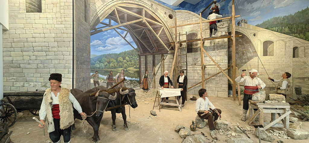 Единият от тях е запечатал момент от строежа на моста. Показано е как материалите за градежа, камъните, са карани отдалеч с волски коли, вижда се издигнатото от майсторите строително скеле, върху което зидарите работят неуморно, за да бъде завършен мостът в обявения срок. Фигурите на Уста Колю Фичето, калфите и чираците му са направени толкова убедително и с такъв художествен професионализъм, че изглеждат като живи и създават усещането, че във всеки един момент ще се раздвижат и ще проговорят. Освен фигурите на хората са изобразени и два вола, теглещи колата, която току-що е докарала огромните каменни блокове за моста. На заден план на строежа пък е представена красивата горска природа с кротко течащата под моста река Янтра.