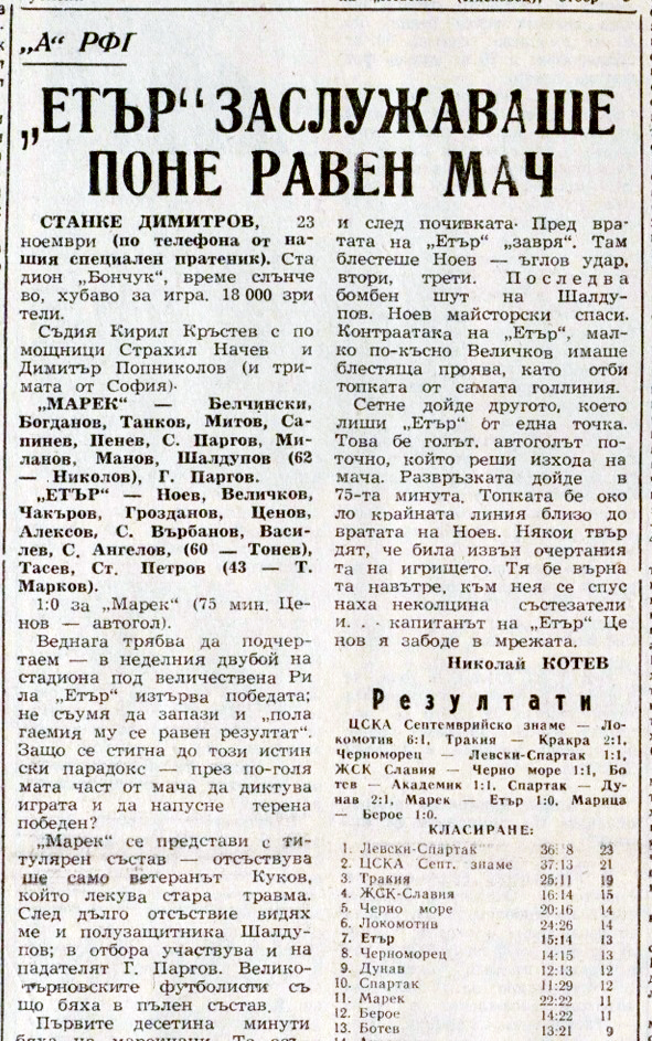 “Течението”, запазените броеве на “Борба” също потвърждават, че Николай Котев, освен от селско стопанство, се интересувал и пишел и за спорт. През есента на 1969-та е специален пратеник на вестника до Станке Димитров и праща по телефона информация за срещата на “Етър” с местния “Марек”. Изказът на журналиста, веднага проличава, е на топовно разстояние от трафаретното писане. Тогава “Етър” бил на седмо място в класирането в “А” Републиканска футболна група (РФГ)… Косвено потвърждение е и тази публикация за ролята на Николай Котев като кръстник на стадион “Ивайло”!