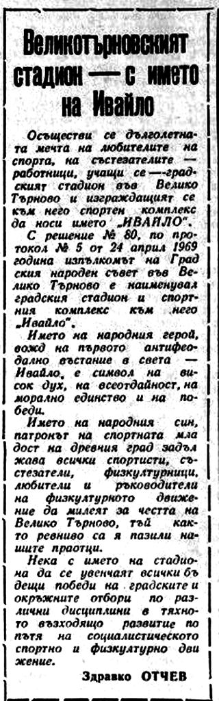 …Прочетох преди няколко години за идея за прекръщаване на стадион “Ивайло” на “Трифон Иванов”. Мина и замина. Не че има нещо лошо, укорно. Така направиха в София и при “Левски” – вместо “Герена” съоръжението вече е “Георги Аспарухов”. И стадионът на “белите” в “Овча купел” днес не е “Славия”, а “Александър Шаламанов”. А пловдивчани имат игрище-стадион “Тодор Диев”.