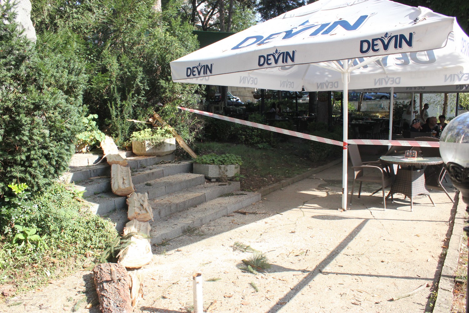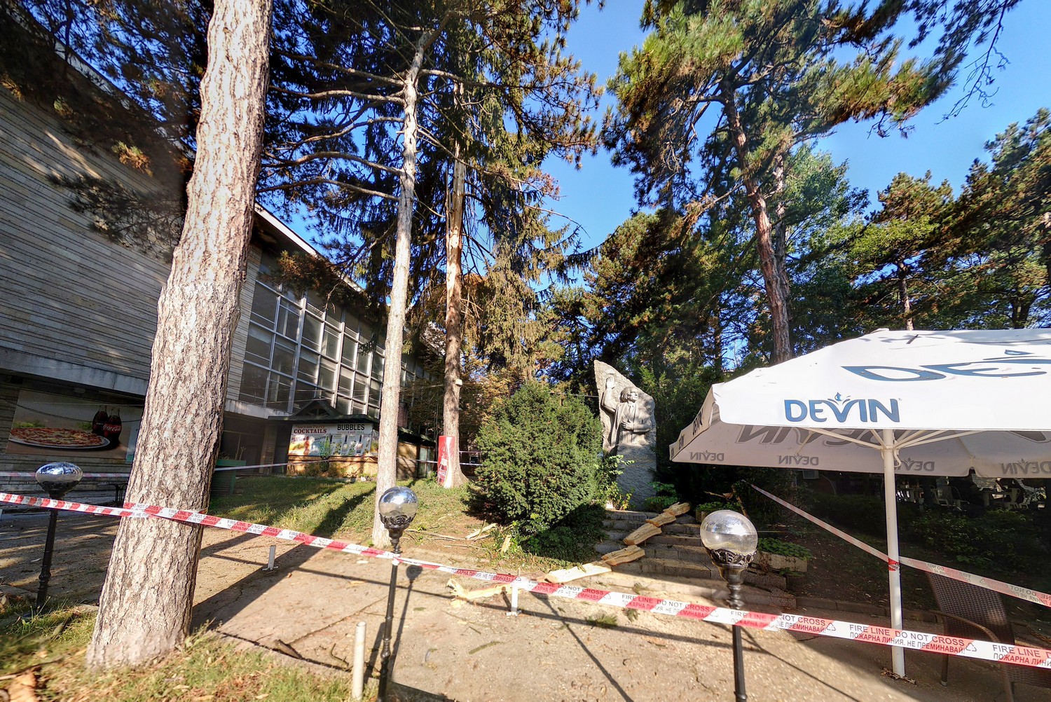 Част от разцепено от мълния дърво се стовари в непосредствена близост до клиенти на заведение в градинката на великотърновския театър. При инцидента няма пострадали. За щастие в лошото време на детската площадка, точно под огромните борове, не са играели деца.