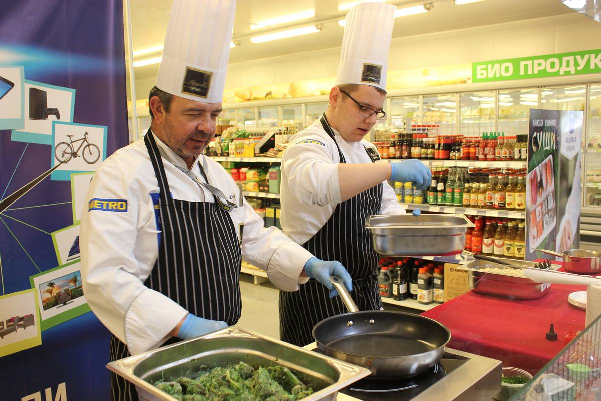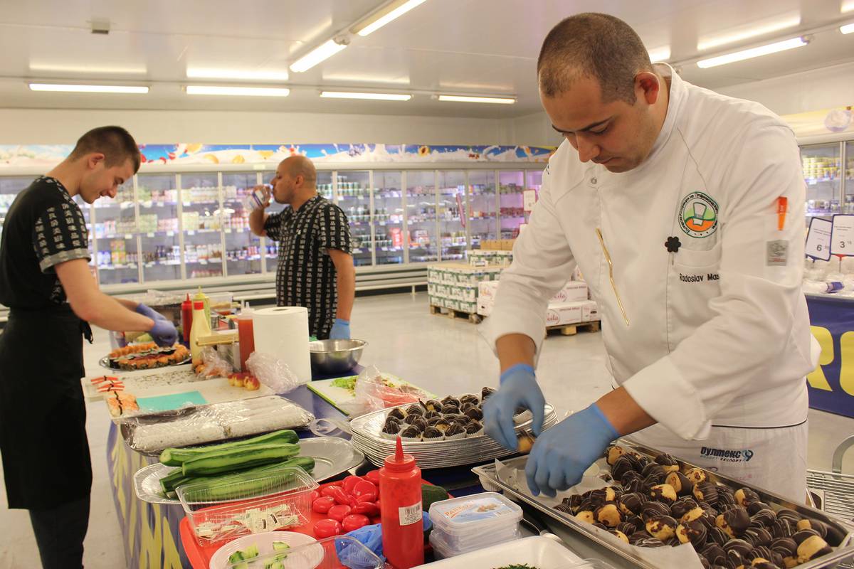 Празникът продължи с демонстрационно готвене в отдел “Млечни” на азиатска кухня. Вкусните източни ястия бяха приготвени от Шеф готвач Юри Велев и екипът на великотърновския му колега Радослав Машков.