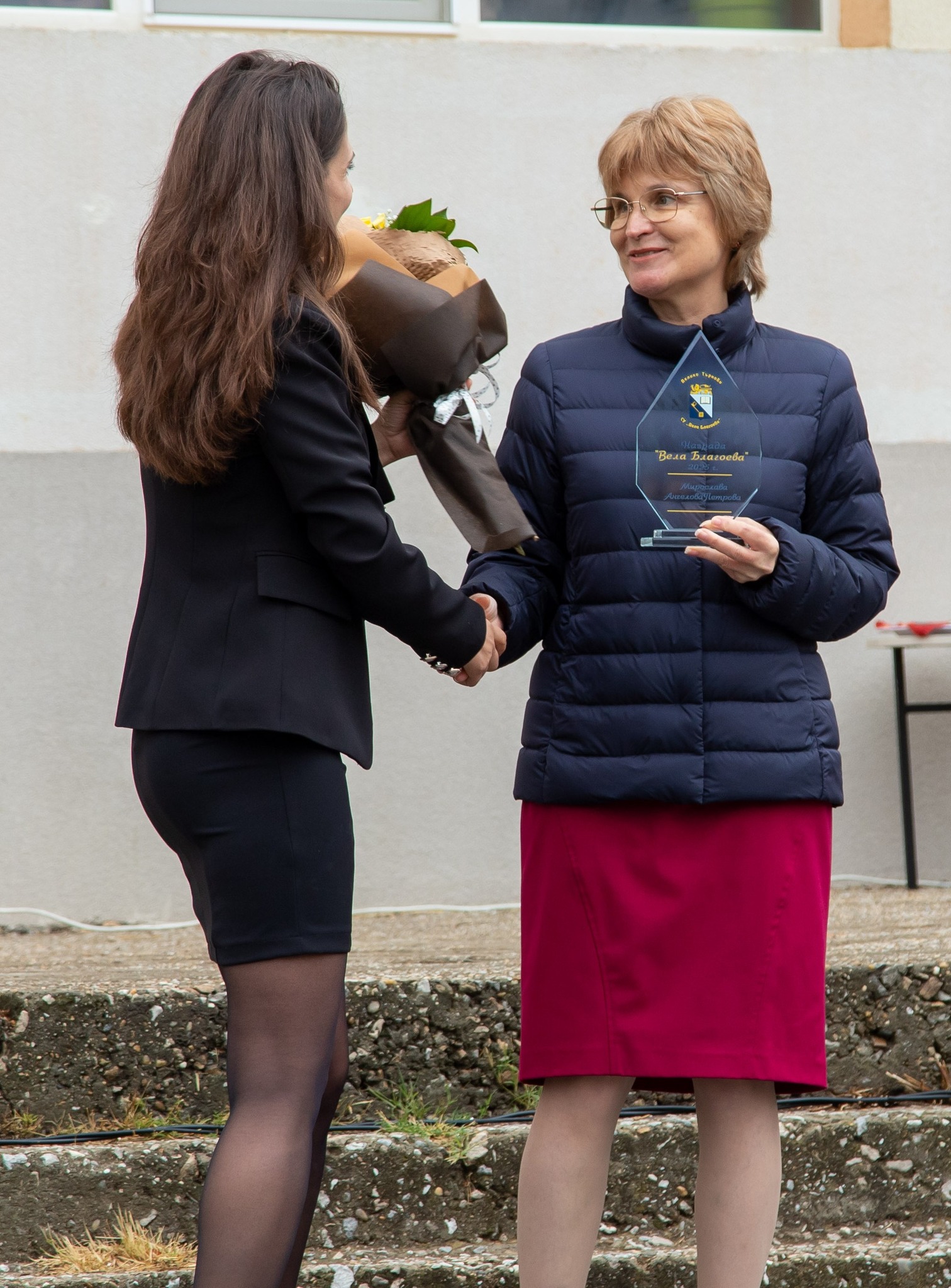 „От пет години връчваме учителската награда „Вела Благоева“. Първият носител бе доскорошната директорка г-жа Марияна Христова, а след нея – редица доказани преподаватели. С решение на Педагогическия съвет носител за 2025 г. е г-жа Мирослава Петрова – старши учител по английски език, за приноса й към дейността на училището. Тя е доказала себе си в своята работа, но освен това е спечелила не един проект по програма „Еразъм“, които дават възможност на много педагогически специалисти от училището да пътуват и получават висока квалификация в чужбина“, заяви директорът на СУ „Вела Благоева“ Зорница Вичева, която връчи наградата.