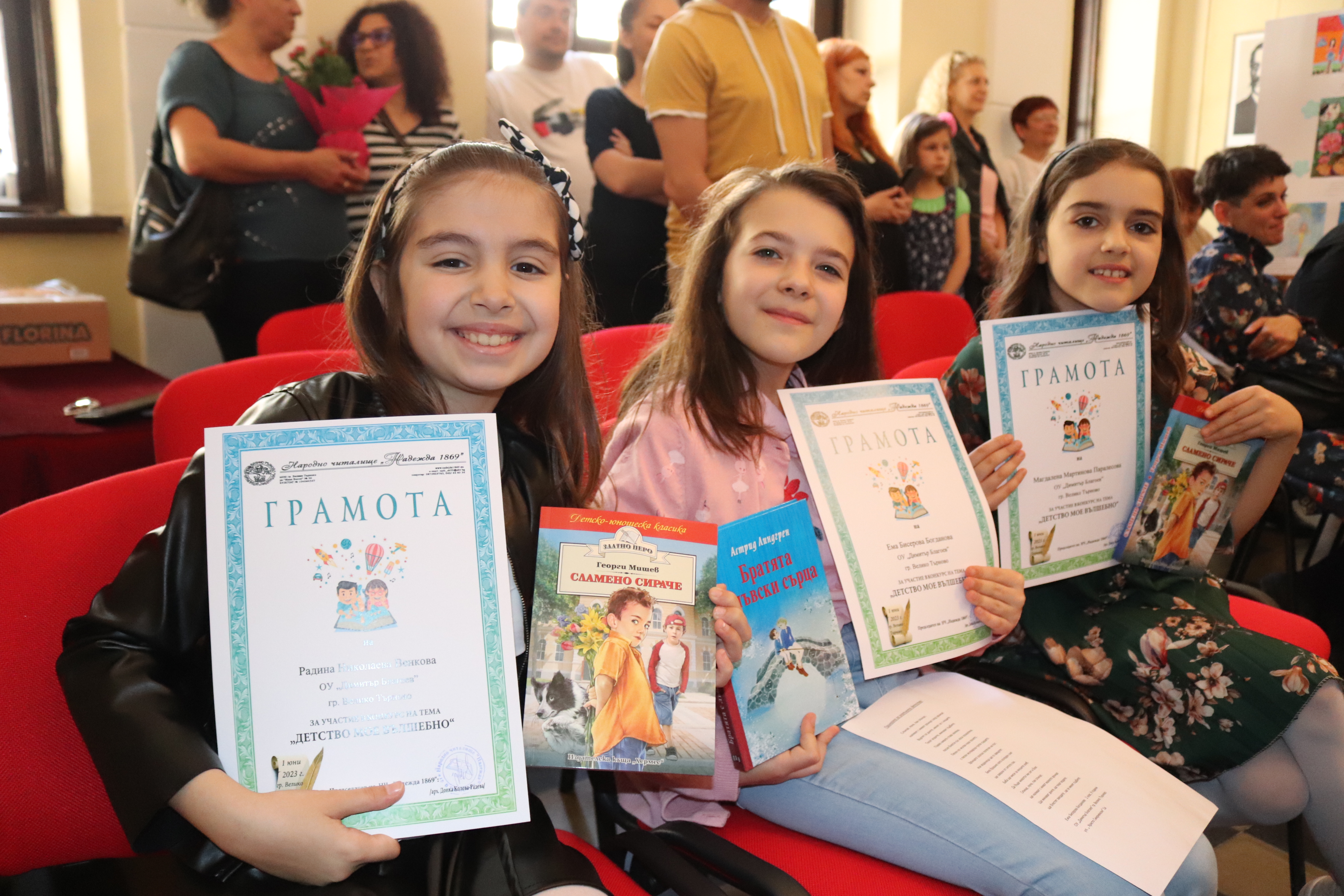 Отличените в националния детски конкурс на читалище „Надежда“ във В. Търново „Детство мое вълшебно“ получиха своите награди на тържествена церемония, провела се в културната институция. В седмото издание на надпреварата, което за втора година е и национално, се включиха участници от 47 населени места в страната, представяйки се със 72 стихотворения, 52 разказа и 406 рисунки.