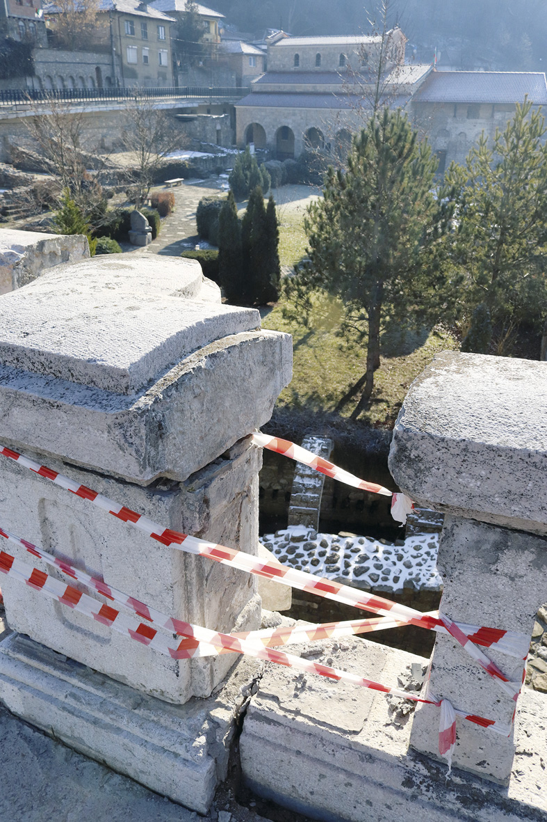 Каменният мост “Цар Борис III” край църквата “Св. 40 мъченици” във В. Търново продължава да се руши. Хората от квартал “Асенов” са притеснени, че пукнатините по съоръжението стават все по-големи и опасни. На три места има откъртени парчета и липсващи части от каменните перила. Последният случай е от Коледа, когато мостът осъмва с още една откъртена масивна част в единия край, а няколко парчета от камъка са паднали в двора на църквата, видя екип на “Янтра ДНЕС”. На противоположния край на перилата друг голям къс е “на косъм” да падне край намиращата се отдолу къща. Парчетата са поставени на местата си, но реално не са укрепени по никакъв начин. На този етап не е ясно дали става въпрос единствено за компрометиране на облицовъчните материали, или за по-сериозни поражения.