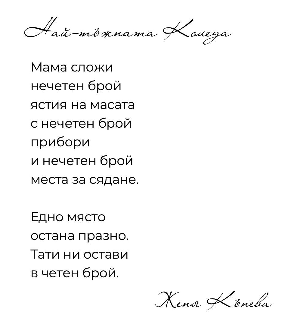 Млада търновска поетеса е обявена за “розовото момиче на българската поезия”. Женя Кънева е само на 26 години, но вече има издадени две стихосбирки и десетки хиляди читатели в социалните мрежи като “Тик ток”, “Инстаграм” и останалите. Самата Женя разказва, че пътят ѝ към поезията започва още от ранна детска възраст, но се засилва след загубата на нейния баща Евгени Кънев. Той е известен на всички почитатели на хубавата музика във Велико Търново с павилиона си за продажба на дискове и аудиокасети на ул. “Мармарлийска”. Евгени напусна този свят нелепо преди 2 години. “След като загубих баща си, един от малкото останали мъже в цяла България, пътят ми ме отведе към една все по-задълбочена работа в сферата на поезията. Създадох свое онлайн пространство в социалните мрежи: kaneva.poetry. В него се престраших да споделям стиховете си и за моя голяма изненада успях да достигна до много голяма част от младата аудитория, интересуваща се от поезия и намираща себе си в моята история”, разказва Женя. Успехът ѝ продължава след като с нея се свързва издателство, работещо с млади “дигитални” поети, с помощта на което през 2022 г. излиза и първата стихосбирка на Женя “Докато смисълът си ти”. “Книгата ми разказва за пътя, през който се наложи да мина, след като загубих най-важния мъж в живота си и е изцяло посветена на него. Стиховете ми по думите и на читателите, и на издателството са емоционални, красиви и вдъхновяващи. Едно от най-известните ми творения, което и днес хората често обичат да споделят в социалните мрежи, е “Дъщеря на баща си”, разказва младата поетеса. Първата ѝ стихосбирка, предизвикала “истински фурор” сред почитателите, които вече надхвърлят 10 хил. човека. Година след този успех, Женя издава и втората си стихосбирка, “Не успя да си тръгнеш”, която излиза в края на 2023 г. “Работата ми като писател ме запозна със стотици изключително мили и стойностни хора, преживели същото като мен и споделящи моята история. Тяхната реакция ме кара до ден днешен да се чувствам горда от това, което успях да постигна, и от това, че успявам да помогна дори и само чрез думите си на хората да преживяват загубите на близките си по-лесно и с повече вяра. Историята, която разказвам в книгите си, не е само за загубата на любим човек, но и за силата да се изправим отново след това и да създадем едно по-хубаво, вдъхновяващо и “розово” начало. Горда съм с това, че имам свой собствен почерк не само в писането, но и в начина си на изразяване. Издателството, с което работя, неведнъж ме е описвало като “розовото момиче на българската поезия”. Поезията ми е съвкупност от любов, болката от загубата и “розовата сила”, както обичам да я наричам аз, която ти дава тласък отново да вървиш напред към сбъдването на мечти и покоряването на нови върхове”, споделя младата поетеса. Повечето от нейните стихове са кратки, но запомнящи се за цял живот. “Аз ще пазя спомена. Ти пази мен”, гласи краткото двустишие, озаглавено “Обещание до небето”. “Но и през смърт, през пръст и през болка от сърцето не успя да си тръгнеш. Нито аз да те пусна”, споделя тя в монолог със своя баща. “Колкото повече животът ти дава да страдаш., толкова повече трябва да сияеш. Защото сама ти излизаш победител. Не можеш да промениш миналото. Но това, което можеш да направиш, е да го превърнеш в хубаво бъдеще”, съветва поетеса