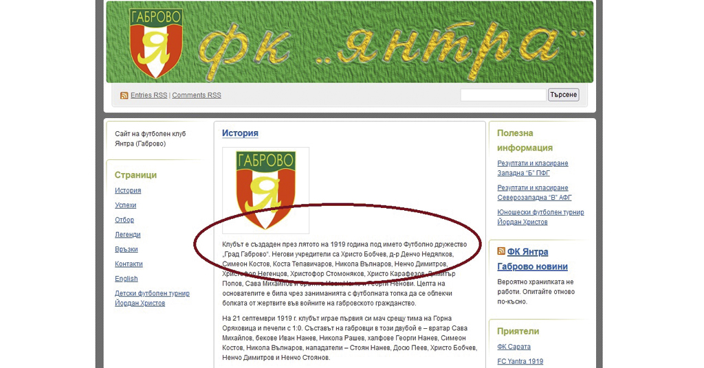Нека видим историята на другите около нас клубове. Разровихме се в историята на “Янтра” (Габрово) и “Локомотив” (ГО), публикувана в справочници, сайтове, уикипедия… В повечето от тях е посочено, че “Янтра” е основан през лятото на 1919 г. Всъщност тогава е основан клуб под името “Футболно дружество град Габрово”. През 1920 г. той минава към дружество “Юнак”, след това става “Балкан”, “Ото”… През 1925 г. приема името “Чардафон”, с което десетилетия е известен на футболната общественост. И така се казва чак до 1969 г., когато приема името “Янтра”. Да, но това не пречи днешният клуб да се казва именно “Янтра 1919”!