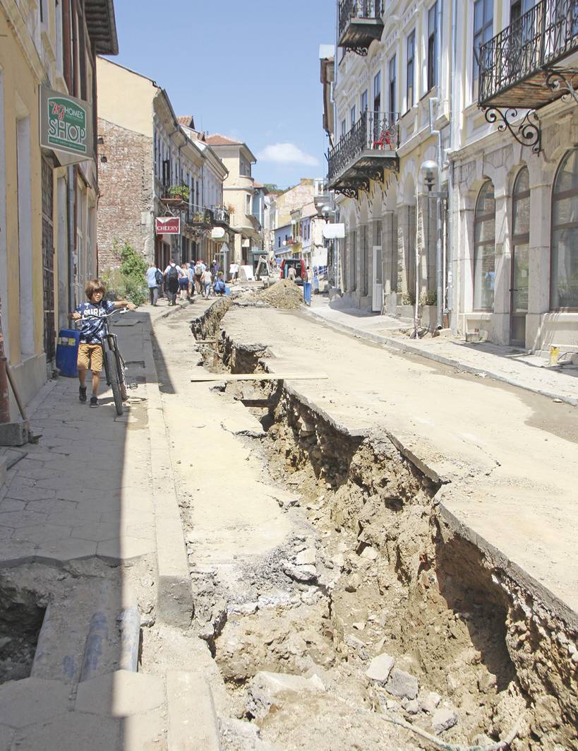 Истински кошмар изживяват туристите във Велико Търново, които в най-отпускарския месец на година са решили да разгледат историческите и културни забележителности в старата част на града. Навсякъде е разкопано, бръмчат различни машини. Краката ти се пълнят с прах и пясък, но това сякаш е по-малкият проблем, защото постоянно трябва да внимаваш къде стъпваш, за да не си изкълчиш глезена. От паметника “Велчова завера” към Царевец имаш усещането, че си в Бейрут, а не в един от най-посещаваните български градове.