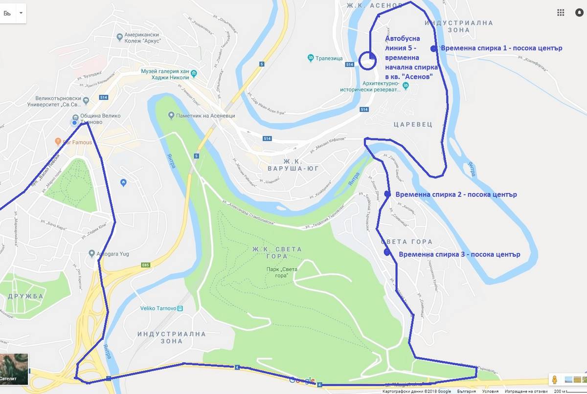Автобус №5 ще продължи да обслужва квартал „Асенов“, а маршрутът му търпи следното временно изменение. В посока на движение от централната част към жилищната зона в подножието на Царевец линията ще достига по утвърденото си трасе до кръстовището при каменния мост /до църквата „Св. Четиридесет мъченици“/. Там автобусите ще обръщат и ще потеглят обратно по ул. „Св. Климент Охридски“, пътя зад крепостта Царевец, ул. „Сливница“, ул. „Димитър Найденов“, ул „Теодосий Търновски“, главен път Варна – Велико Търново, Южен пътен възел, ул. „Христо Ботев“. От ул. „Васил Левски“ към кв. „Колю Фичето“ „петицата“ продължава по утвърденото си трасе. В това направление ще бъдат обособени три временни спирки – до въжения мост над р. Янтра /срещу бившата фабрика „Васил Мавриков“/, до кръстовището на ул. „Димитър Найденов“ и ул. „Сливница“ и до детската градина в кв. „Света гора“.