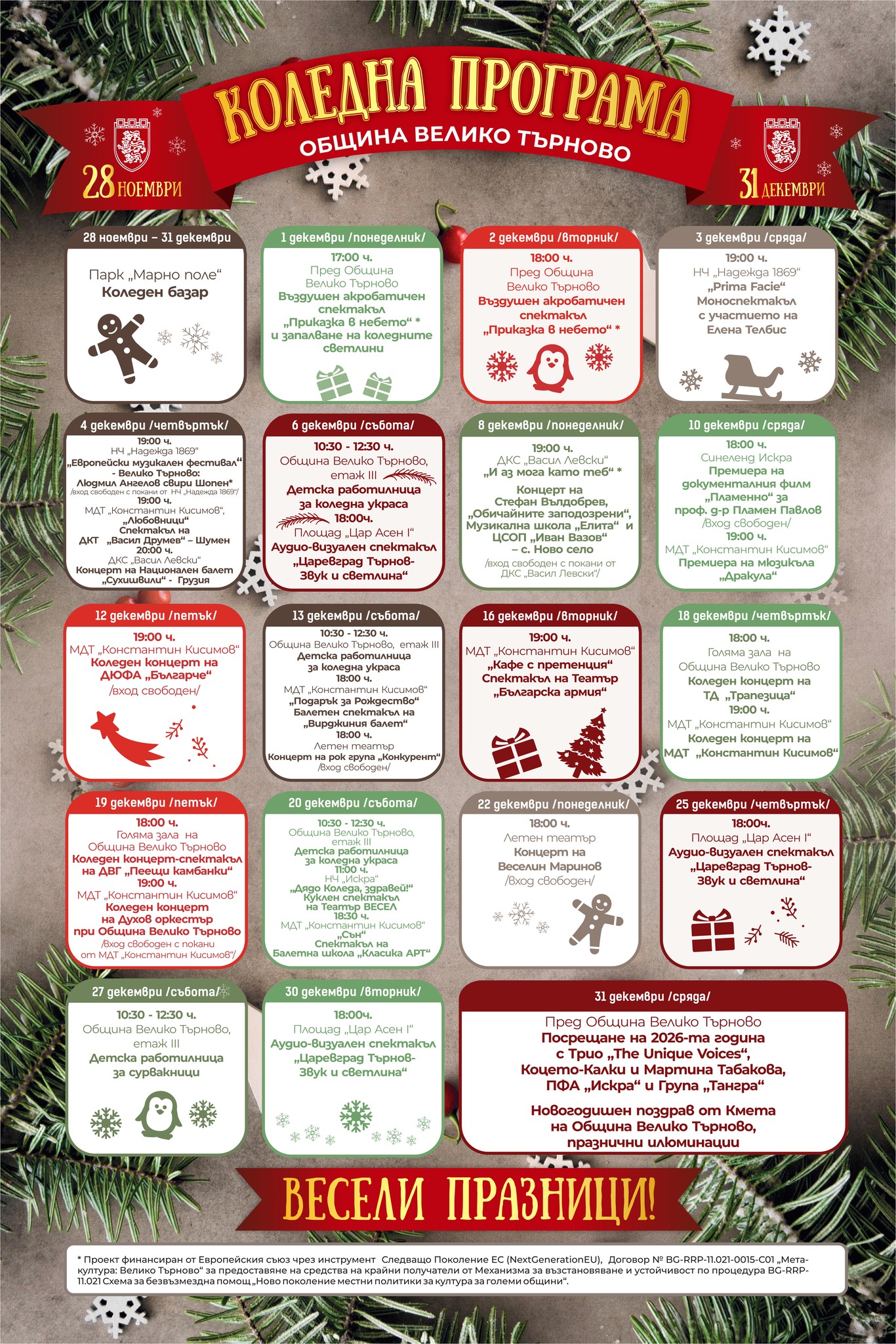 С богата програма Община Велико Търново ще зарадва жителите и гостите на града през празничния декември. Целият месец ще е изпълнен с концерти, културни събития, спектакли, атракции за малки и големи, детски работилници и празнични изненади, които ще се проведат в периода от 1 до 31 декември.