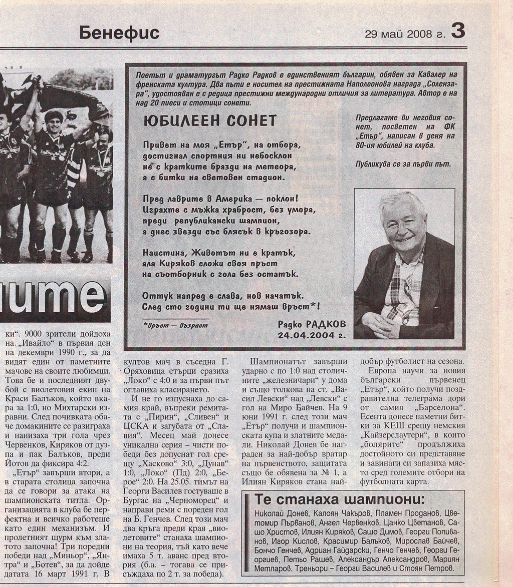 И докато подготвяхме броя, в редакцията неочаквано влезе Радко Радков. Изненадах се, защото не знаех да има афинитет към спорта. “Имам юбилеен сонет за нашия “Етър”, каза ми Радко. – Написах го на 24 април 2004 г. за 80-ия юбилей, но досега не съм го показвал на никого…” И извади листа със собственоръчно написаната творба.