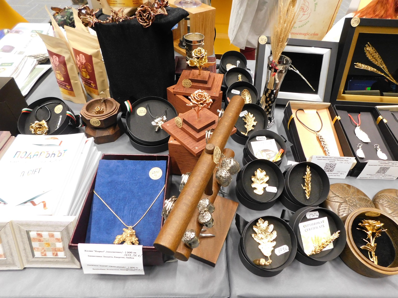Многообразието на сувенири по щандовете на изложението наистина впечатлява. Един от щандовете, привличащ вниманието, е на „Магията на българската роза“ ООД от с. Неофит Рилски. Красивите им цветя са правени по елетролитен път – галваника, галванотехника, галванопрастика. „Това е световноизвестна технология. Живи растения метализираме първо на мед, после ги посребряваме и позлатяваме – това са уникати бижута, които са за ежедневието и дома, за фирмени подаръци. Не са правени по калъп, създала ги е самата природа. Най-интересното е, че запечатвайки самото растение, вътре се запазва и генът му, понеже няма процес на гниене, а на мумифициране. Носейки такова бижу, човек става и пазител на гена на растението“, разказват Цветомир и Светла, които са облечени в автентични носии.