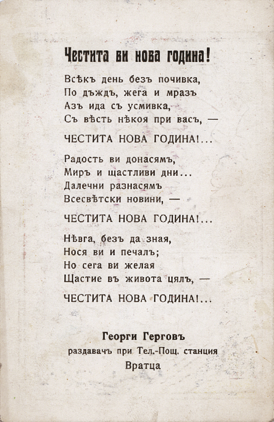 На някои от картичките пък от задната страна са отпечатани поздравителни стихотворения за празника и са били пускани до гражданите от раздавачите. Едната от тях е с подател: “Георги Гергов, раздавач при Тел.-Пощ. Станция Вратца”
