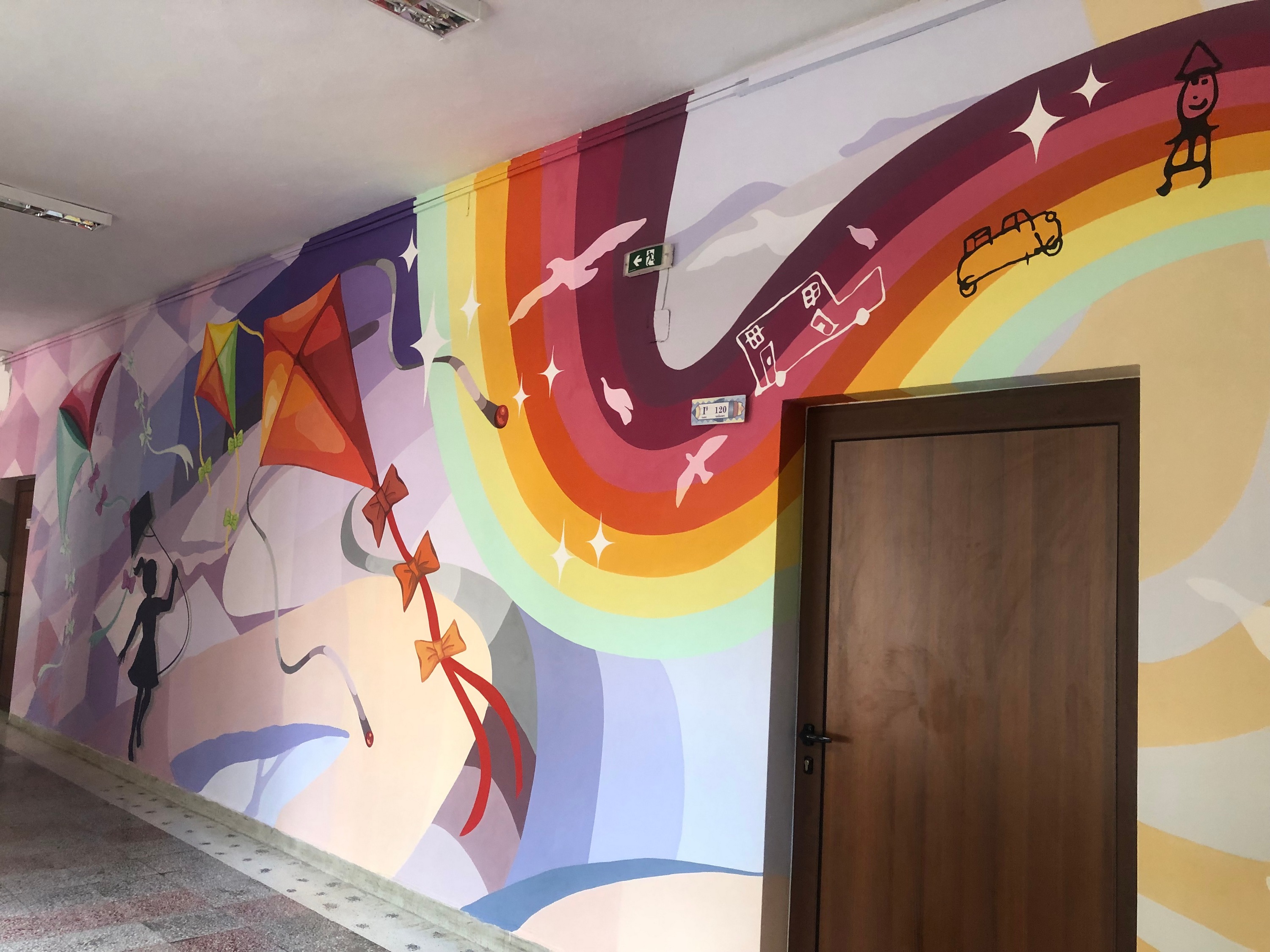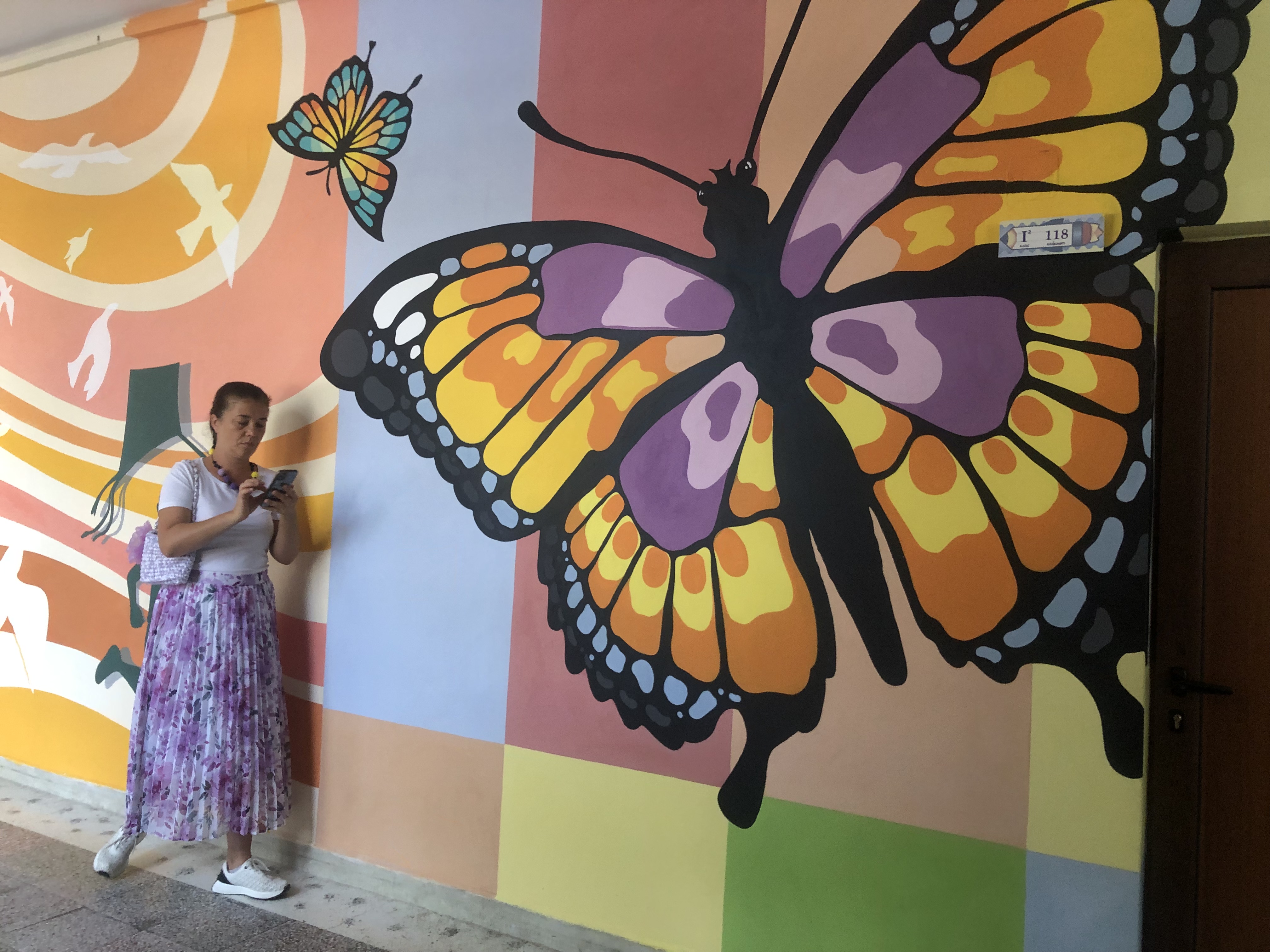 Студенти от Факултета по изобразително изкуство на Великотърновския университет изрисуваха огромен стенопис на първия етаж в СУ „Емилиян Станев“ във Велико Търново.