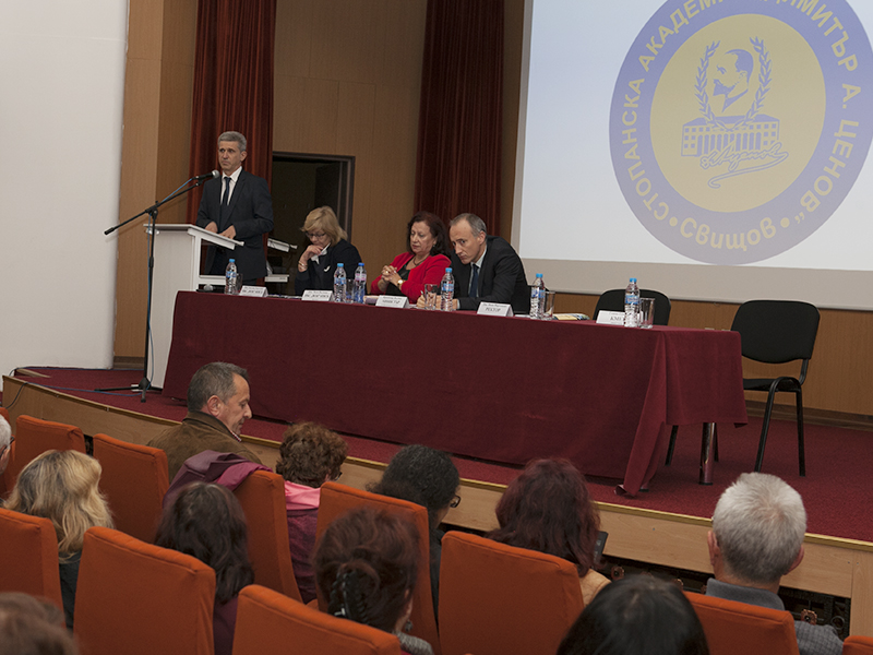 Министър Вълчев коментира тенденциите в развитието на образователната система в страната и сподели какви промени се предвиждат в Закона за висшето образование и в политиката по приема на студенти. Той изрази позицията на МОН по казуса със Стопанската академия, като потвърди, че проблемите са резултат както от допуснати грешки в миналото, така и от обективни процеси. „При Вас дойдоха няколко беди наведнъж – имиджов проблем, който съвпадна с началото на реформата в приема, обстоятелството, че сте локализирани в относително малък град, промените в нагласите на младите хора за избор на място за продължаване на образованието”, каза министърът Вълчев в обръщението си към академичната общност и показа, че е много добре запознат със ситуацията във вуза. Той отдаде дължимото на усилията, които Академията прави в последните години за справяне с проблемите, но наблегна на това, че трябват и допълнителни реформи, не само свързани с разходите, но и по отношение на развитие на научните изследвания, включване в европейските университетски мрежи и отваряне към международното образователно пространство. Като част от стратегическите решения за бъдещото развитие министърът препоръча на Стопанската академия да намери това, което може ясно да я отличи от конкурентите – предлагане на образователен и научен продукт с високо качество. Красимир Вълчев заяви, че МОН ще направи необходимото за да подпомогне Свищовската академия при решаването на финансовите й проблеми, но подчерта, че това изисква допълнителни усилия и от двете страни.