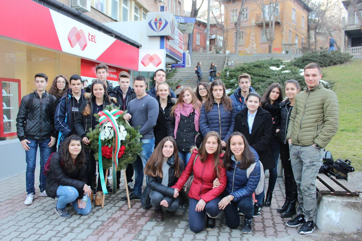 Като истински патриоти пред паметта на Левски се поклониха и десетокласници от ПМГ. По своя инициатива учениците от 10 “г” клас с “Информационни технологии” и класен ръководител Даниела Тодорова са събрали пари за венец, който поднесоха по време на общоградския помен за годишнината от обесването на Апостола. Гимназистите споделиха, че няма българин, който да не знае името на Дякона и не трепне, когато се говори за великите му постъпки.