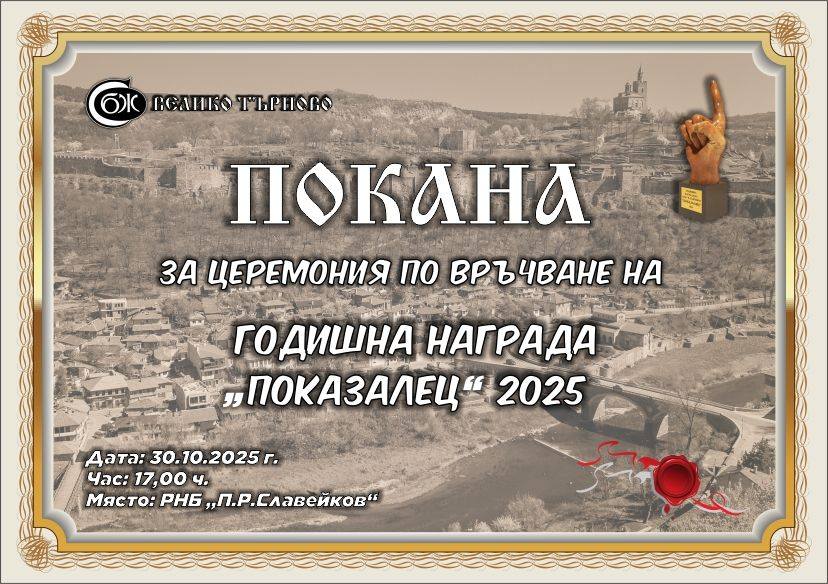 Церемонията за връчването на наградата „Показалец“ ще се състои от 17.00 часа на 30 октомври (четвъртък) в РНБ „П. Р. Славейков“ във Велико Търново.