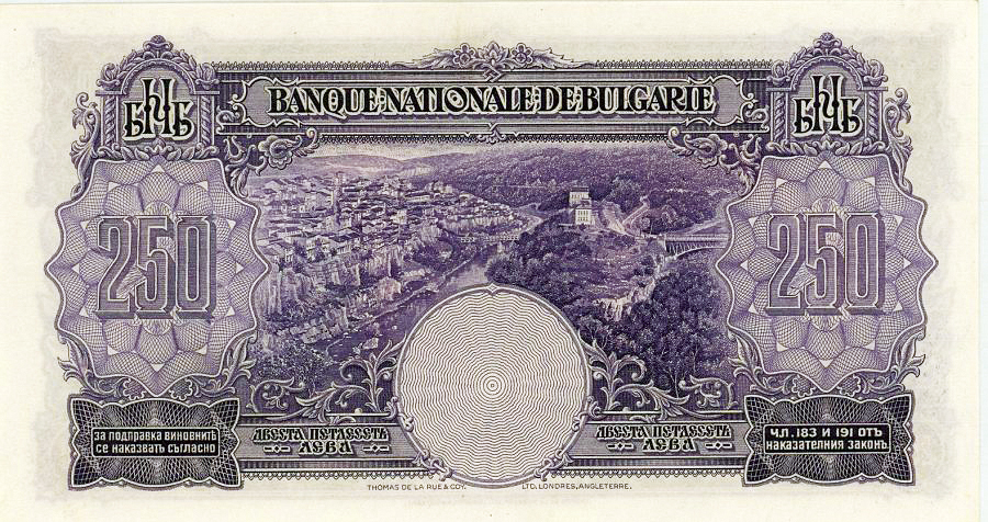 Като една от старите български столици Търновград няма как да не присъства върху българските парични знаци. Това се случва за пръв път обаче чак в емисията от 1929 г. Причината за това е, че до тогава върху банкнотите са се изобразявали само държавния герб (по руски образец), или репродукции на картини, пресъздаващи традиционни български поминъци като бране на рози, на тютюн, оран, сеитба и др. Емисиите от 1925 и 1929 г. са първите, при които върху гърба на банкнотите се изобразяват известни български сгради. На банкнотата от 500 лв. е представено Искърското дефиле, на банкнотата от 5000 лв. е храм-паметникът “Ал. Невски”, а на тази от 250 лв. е показан изглед от Търново. Интересното е, че напълно случайно банкнотата с пейзажа от Търново е виолетова, а това е цветът, който десетилетия по-късно става официален за старата столица. На реверса на банкнотата е показана местността Боруна и лъкатушещата река Янтра, от лявата страна на която се вижда и част от старата градска част. А на аверса й е изобразен цар Борис III във военна униформа и държавният герб. Банкнотата е отпечатана през 1930 г. в Лондон, но влиза в обръщение чак през 1940 г. и е в обръщение до 1947 г. Автори на дизайна са Васил Захариев и Александър Божинов. Тиражът й е бил 5 млн. броя. След идването на комунистите на власт и решението за отпечатване на нови банкноти, старите са унищожени. Поради тази причина виолетовата банкнота с Търново е истинска колекционерска рядкост. Тя е уникална и с това, че е първата българска банкнота, върху която е изобразена макар и само част от български град. И напълно заслужено това е старата столица Търновград.