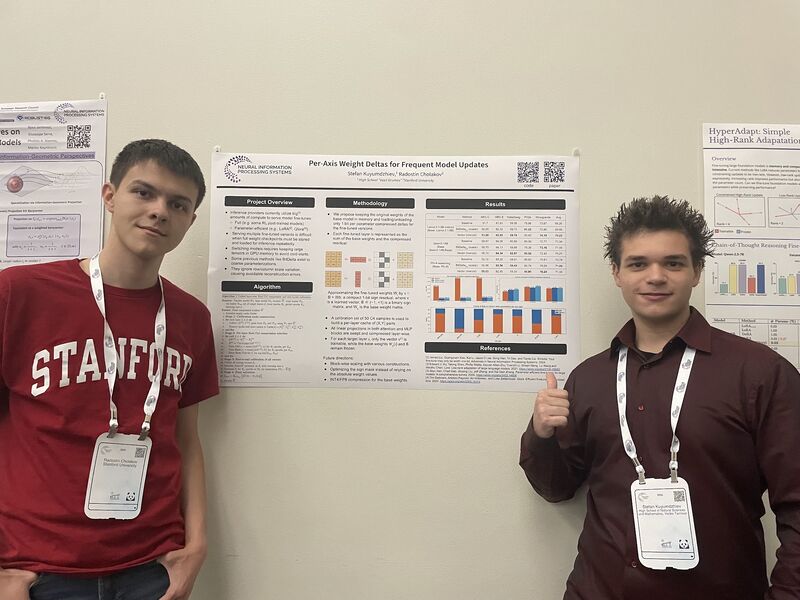18-годишният Стефан Куюмджиев, ученик в 12 клас в ПМГ „Васил Друмев“ в старата столица, взе участие конференцията Neural Information Processing Systems. Тя е сред най-престижните и влиятелни научни форуми в света в областта на невронните мрежи, машинното обучение и изкуствения интелект. Събитието събира водещи учени, академици и представители на технологични компании като Google, Microsoft и Meta, както и изследователи от най-добрите университети в света. Тази година NeurIPS се проведе в Сан Диего от 2 до 7 декември. „На тази 39-та годишна конференция моята статия Per-Axis Weight Deltas for Frequent Model Updates, която предоставя решение за оптимизиране на зареждането на големите езикови модели бе класирана сред 8-те най-добри в категорията AI That Keeps Up: Workshop on Continual and Compatible Foundation Model Updates (CCFM) и допусната за лекционно представяне“, разказва Стефан. Статията е разработена под менторството на Радостин Чолаков, студент втори курс в университета Станфорд с изявени интереси в областта на изкуствения интелект и машинното обучение. Той има опит в научни проекти, свързани с оптимизацията на големи езикови модели и участва като ментор в разработването, и представянето на изследването.