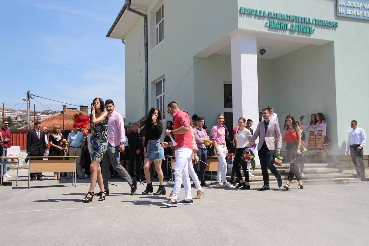 145 момчета и момичета завършват ПМГ “Васил Друмев” тази година. Двама от тях са лауреати от национални олимпиади, а шест са пълните отличници. За своя принос в издигане престижа на гимназията 10 са зрелостниците удостоени с почетната награда на ПМГ – златна значка, двама – със сребърни значки и 37 – с грамоти.
