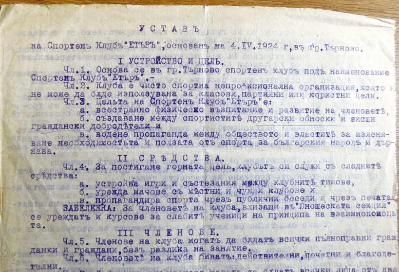 Началото е шокиращо – “Устав на Спортен клуб “Етър”, основан на 4 април 1924 г. в гр. Търново”. Така е и в черновата, и в препечатания след това официален устав на клуба. Сериозни размисли буди и текстът на чл. 60, който гласи: “Клубът празнува своя празник на Благовещение”. Проверих: през 1924 г. Благовещение е било на 7 април. Изглежда логично основателите да изберат този празник за патронен, ако са основали “Етър” в навечерието му. Защото ако датата е 24 април, само три дни по-късно е бил Великден и е било по-логично тогава да е празникът на клуба.