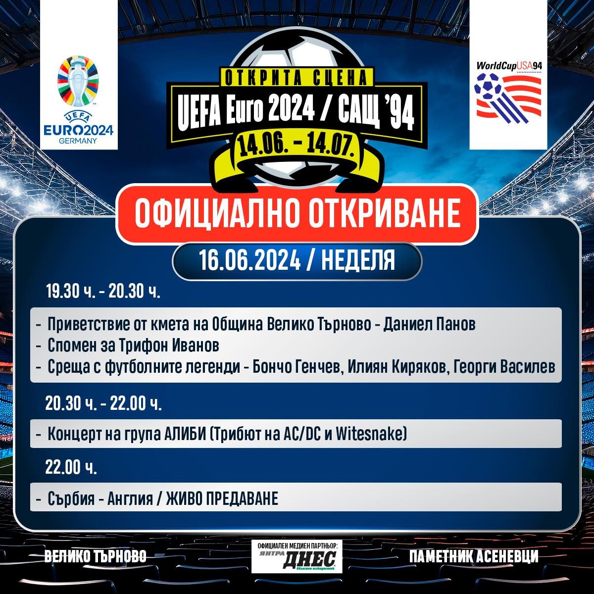 Заради метеорологичните условия обаче самото официално откриване ще бъде в неделя, 16 юни. Програмата стартира от 19:30 ч., като първата проява е среща с легендите на “Етър” от САЩ-94 – Бончо Генчев, Илиян Киряков, както и с треньора Георги Василев, очаква се да стане ясно дали ще успее да дойде и Красимир Балъков. На откриването ще бъде и дъщерята на покойния Трифон Иванов – Марина. От 21 ч. започват изпълненията на група “Алиби” с трибют на AC/DC, Whitesnake, Rainbow, като в края на концерта ще има заря. Тя ще ознаменува началото в 22:00 ч. на интригуващия мач Англия – Сърбия.