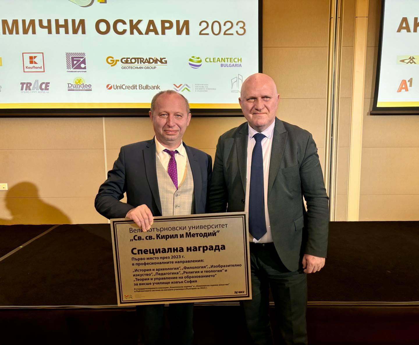 ВТУ “Св. св. Кирил и Методий” и НВУ “Васил Левски” бяха отличени в инициативата “Академични Оскари 2023” за най-добрите висши училища в България. Ректорът на ВТУ проф. д-р Димитър Димитров получи специалната награда за първото място на вуза в професионални направления “История и археология”, “Филология”, “Педагогика”, “Изобразително изкуство”, “Религия и теология” и “Теория и управление на образованието” за висше училище извън София. НВУ “Васил Левски” се нареди на първо място в професионално направление “Военно дело”.