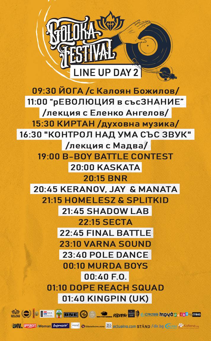 Йога с Калоян Божилов/ Лекция с Еленко Ангелов / Графити занимания / Киртан – духовна музика/ Лекция с Мадва / DJ SET / B-Boy Battle Contest в две части с награден фонд / Kaskata / BNR / Keranov, Jay & Manata / Homelesz & Splitкid / Shadow Lab (Secta, MishMash, НЕМА, N.Kotich) / Secta / Final Battle / Varna Sound / Pole Dance / Murda Boys / F.O. / DRS (Dope Reach Squad) / KINGPIN (UK) //