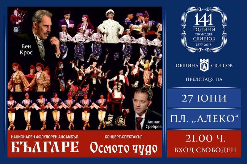Програмата за празника на града ще завърши на централния площад „Алеко“ с Национален фолклорен ансамбъл „Българе“, които от 21.00 часа ще представят пред свищовската публика най-новия си концерт-спектакъл „Осмото чудо“.