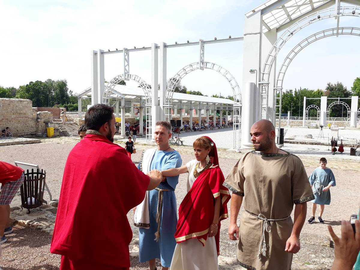 В късния следобед на Принципията се състоя римска сватба, която пресъздаде автентичен сватбен ритуал на древния Рим, през погледа на съвременна сватбена двойка. Кръстина и Александър се врекоха във вярност и любов един към друг пред десетките посетители на XIV-я фестивал на античното наследство “Орел на Дунава“.